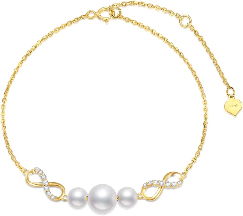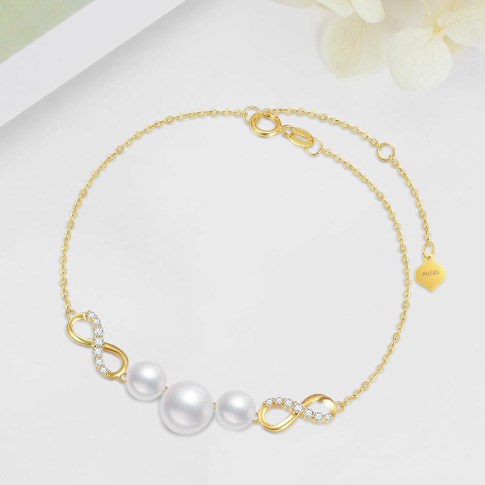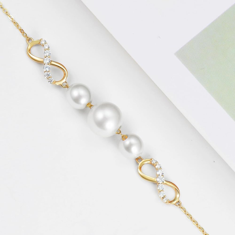【Design】 Decorated with white crated moissanite and pearls, this yellow gold infinity bracelet is a dianty and could fit well with many outfits.
