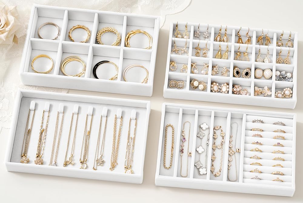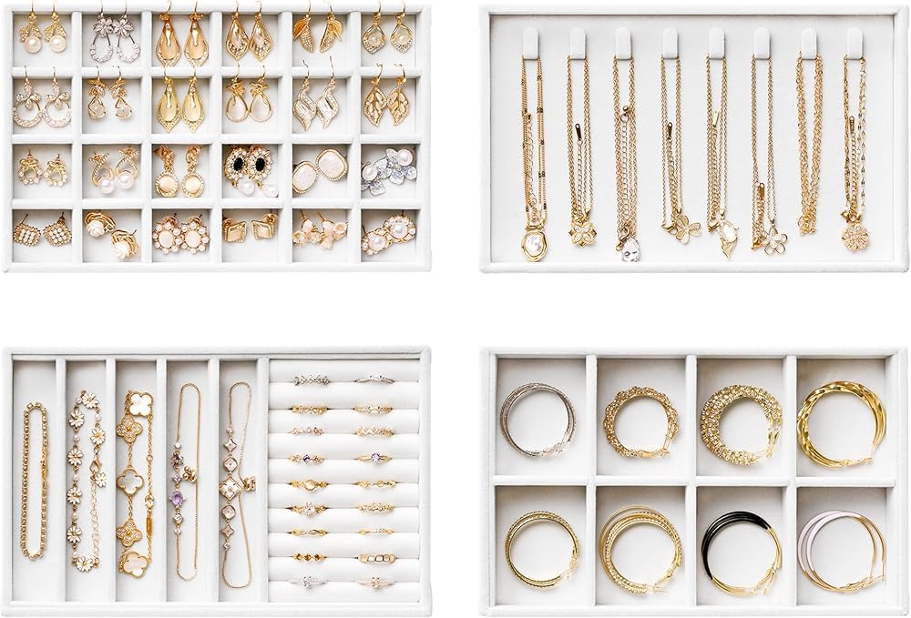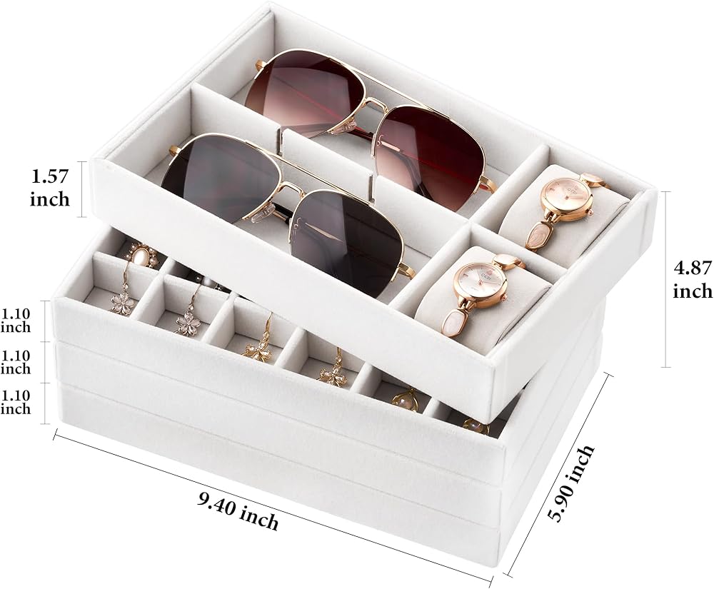 4-Piece Velvet Jewelry Trays Set - This stackable jewelry organizer includes 4 jewelry tray inserts that neatly store and display rings, earrings, necklaces, bracelets, watches, sunglasses and so on. Easily view your collection and find what you need in seconds—no more tangled chains or missing pieces.