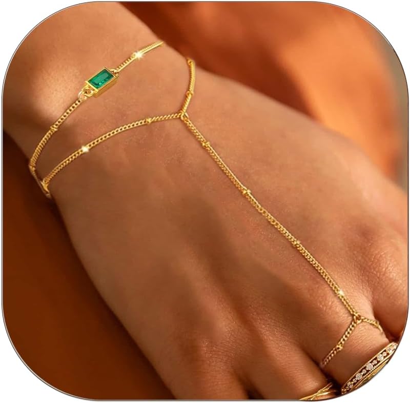 Elevate your style with this exquisite hand chain bracelet that seamlessly combines elegance and contemporary fashion. This dainty gold-tone piece features a unique design that connects a finger ring to a bracelet using a delicate chain, creating a stunning stackable accessory. The birthstone accent adds a personal touch, making it a meaningful and trendy addition to your jewelry collection. Perfect for special occasions or everyday wear, this versatile hand chain bracelet set can be mixed and matched with other jewelry pieces for a customized look. The lightweight design ensures comfort throughout the day while making a bold fashion statement. Whether you're treating yourself or searching for the perfect gift, this charming piece of hand jewelry captures attention with its sophisticated appeal and modern aesthetic.