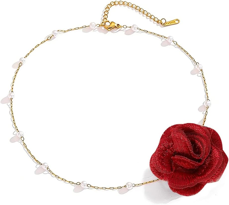 Flower Choker Necklaces for Women Rose Necklace for Women with Pearl Dainty Red Rose Choker Necklace Flower Jewelry Party Prom