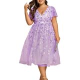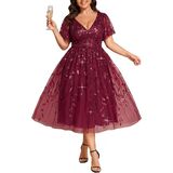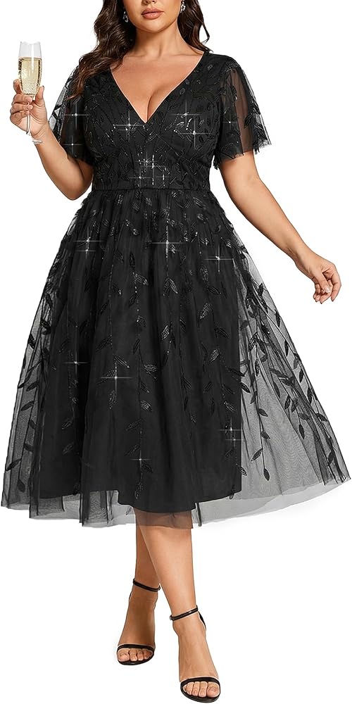 Features: Knee length, no stretch, not padded, with lining; short ruffled sleeves, zipper up the back, sequin, a line, v neck, sexy cocktail dress, glamorous evening dresses, wedding guest dresses