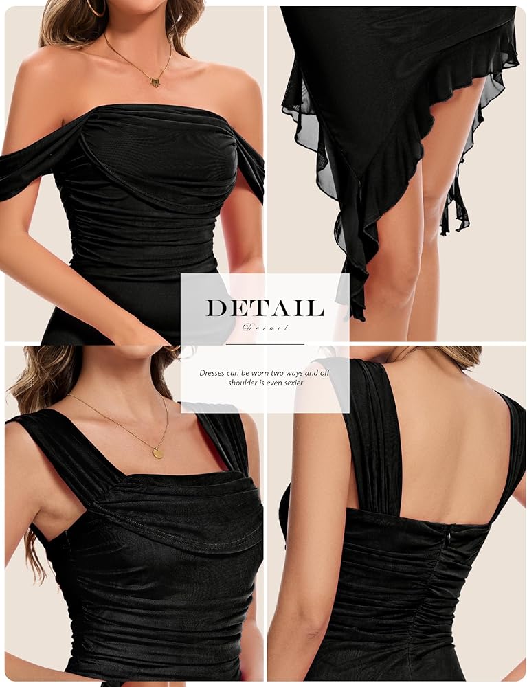 Wedding Guest Dresses Fabric Choice : For formal dresses, the choice of fabric is crucial. This off the shoulder dress is made of stretchy and breathable fabric, which is delicate and soft to the touch, and the luster enhances the temperament. In addition, the pleated design of the chest and waist add a romantic and mysterious atmosphere to the whole dress, and the bodycon dress can also effectively modify the body curves and look more graceful.