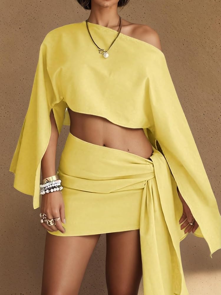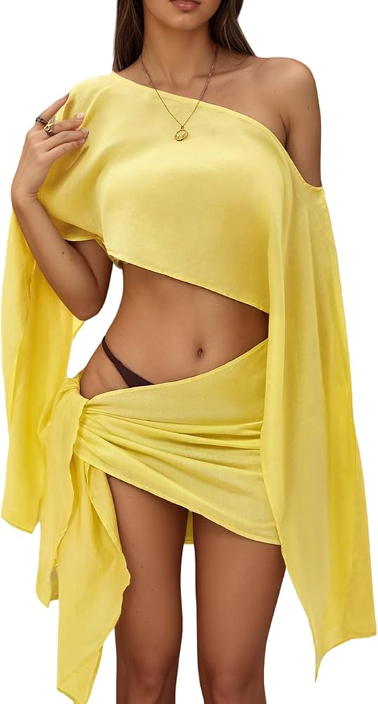 This two-piece cover up set features a one-shoulder cropped top with wide bell sleeves and a matching wrap mini skirt in a soft linen-look fabric The lightweight fit and sarong design offer a breezy Y2K beach vibe