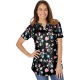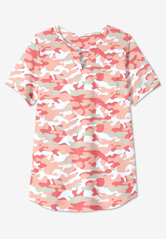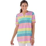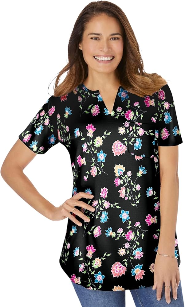 Versatile and stylish, perfect for casual everyday wear. Flattering notch-neck design allows for a comfortable, open, and cool feel without being too revealing. Generously cut to provide a roomy fit for ultimate comfort and ease of movement. Made from a soft and durable cotton/poly blend, ensuring both comfort and longevity. Easy-care fabric is machine washable for your convenience. 28" length falls perfectly on your hips, offering both style and coverage. Available in a variety of colors and patterns to suit your personal taste. Ideal for showcasing body positivity and inclusivity, suitable for confident and stylish women. Imported.