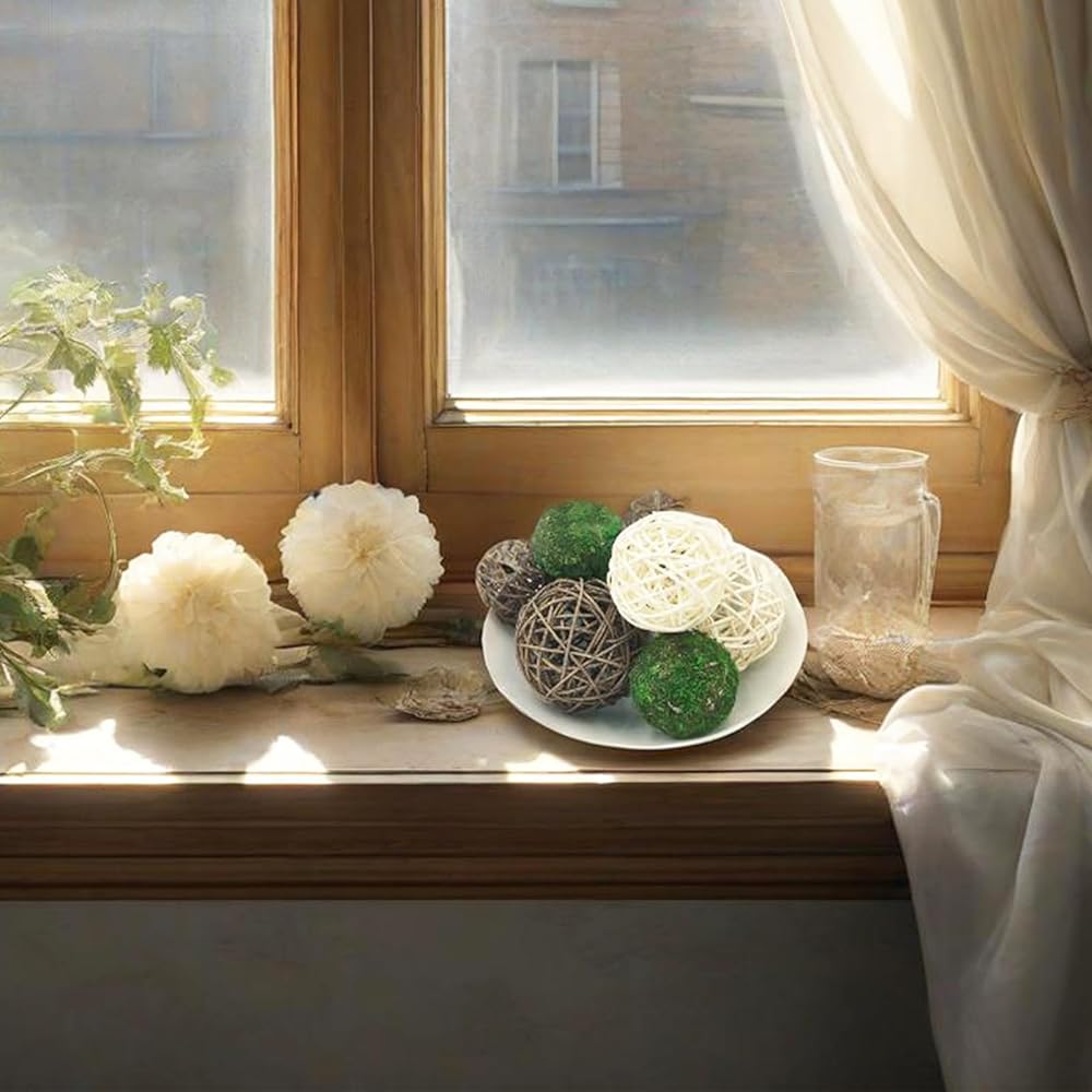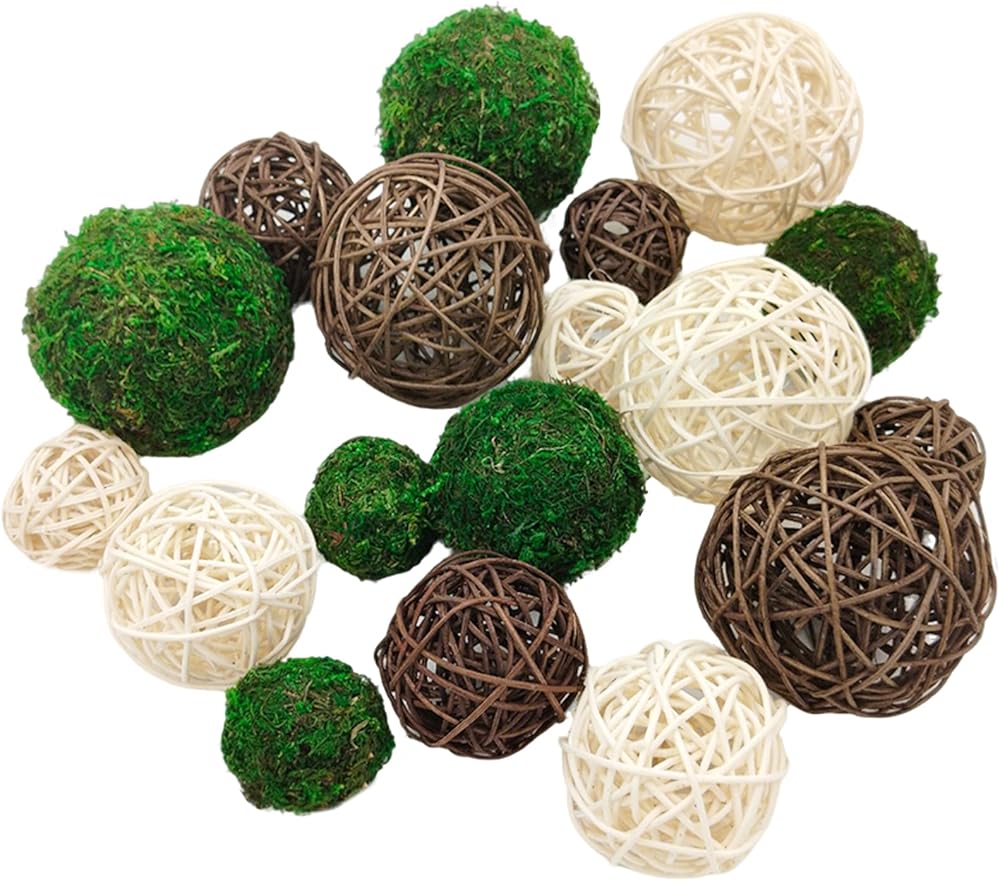 Add a touch of natural elegance to your home decor with this 15-piece decorative ball set. The collection features an artful combination of 5 white rattan balls, 5 brown rattan balls, and 5 moss-covered spheres, each measuring 2.4 inches in diameter. These intricately woven rattan balls showcase beautiful craftsmanship with their intertwining patterns, while the moss spheres provide a lush, organic contrast. Perfect for filling decorative bowls, creating table centerpieces, or arranging in vignettes, these spheres add texture and visual interest to any space. The neutral color palette of white and brown rattan, complemented by the rich green moss finish, allows these decorative balls to blend seamlessly with various interior styles, from rustic to contemporary. Use them individually or group them together to create stunning seasonal displays, mantlepiece arrangements, or as accent pieces in your living space.