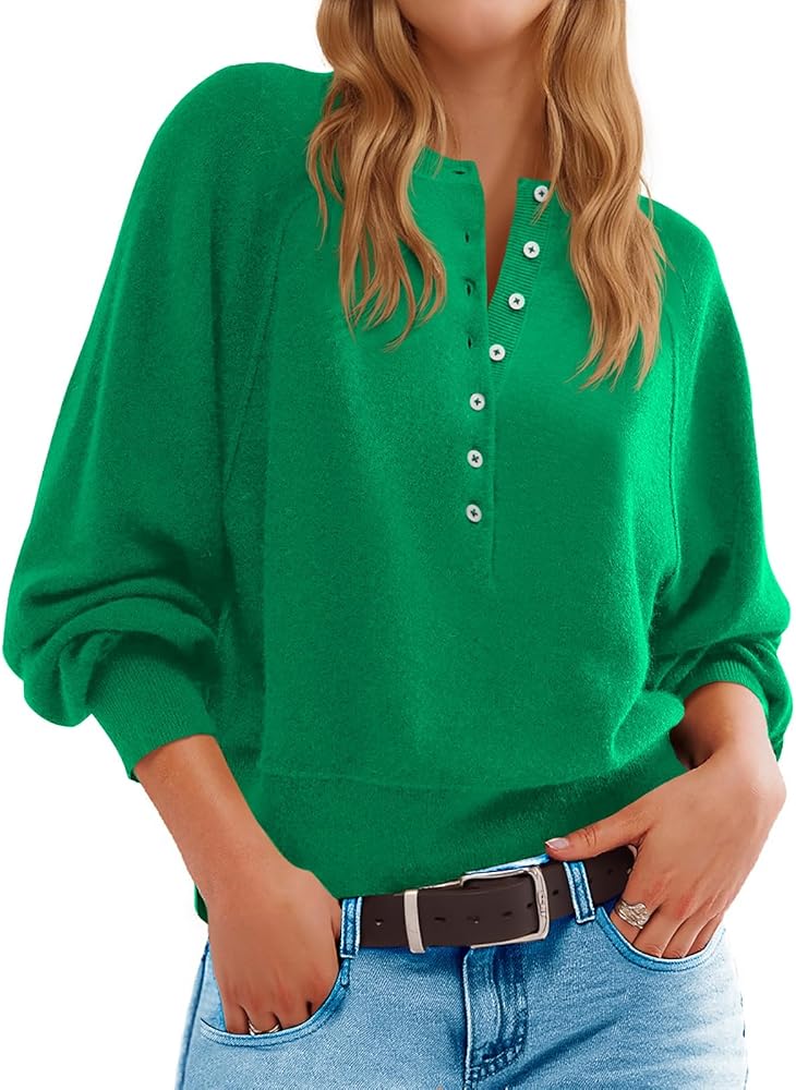 Trend-Forward Design: Womens henley tops long sleeve, batwing sweaters for women, v neck sweaters for women, crew neck sweater for women, lantern sleeve sweater, knit sweater for women, loose sweaters for women. Featuring fashion forward raglan sleeves, a relaxed slouchy fit with exposed seam detailing, fashionable balloon sleeves for a contemporary silhouette. The stylish henley neckline with half button front offers adjustable coverage.
