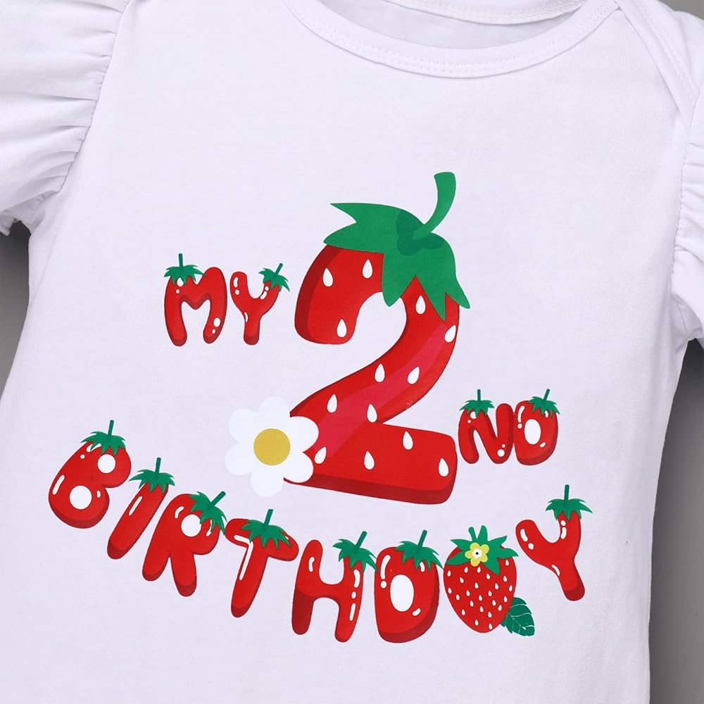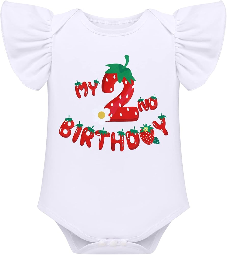 🍓🍓【Red Strawberry Letters Romper Shirt Top】Baby girls berry strawberry first birthday outfit romper tutu skirt headband set with leg warmers clothes. White summer ruffle flutter sleeve o-neck romper / t-shirt tops, printed with glitter shiny letters, strawberry one / two / three / Half Way to One birthday, strawberry my 1st / 2nd / 3rd / 1/2 birthday, special for celebrating your little one's BIRTHDAY. Lapped shoulder bodysuit, open crotch with 3 snaps for changing diaper cover conveniently