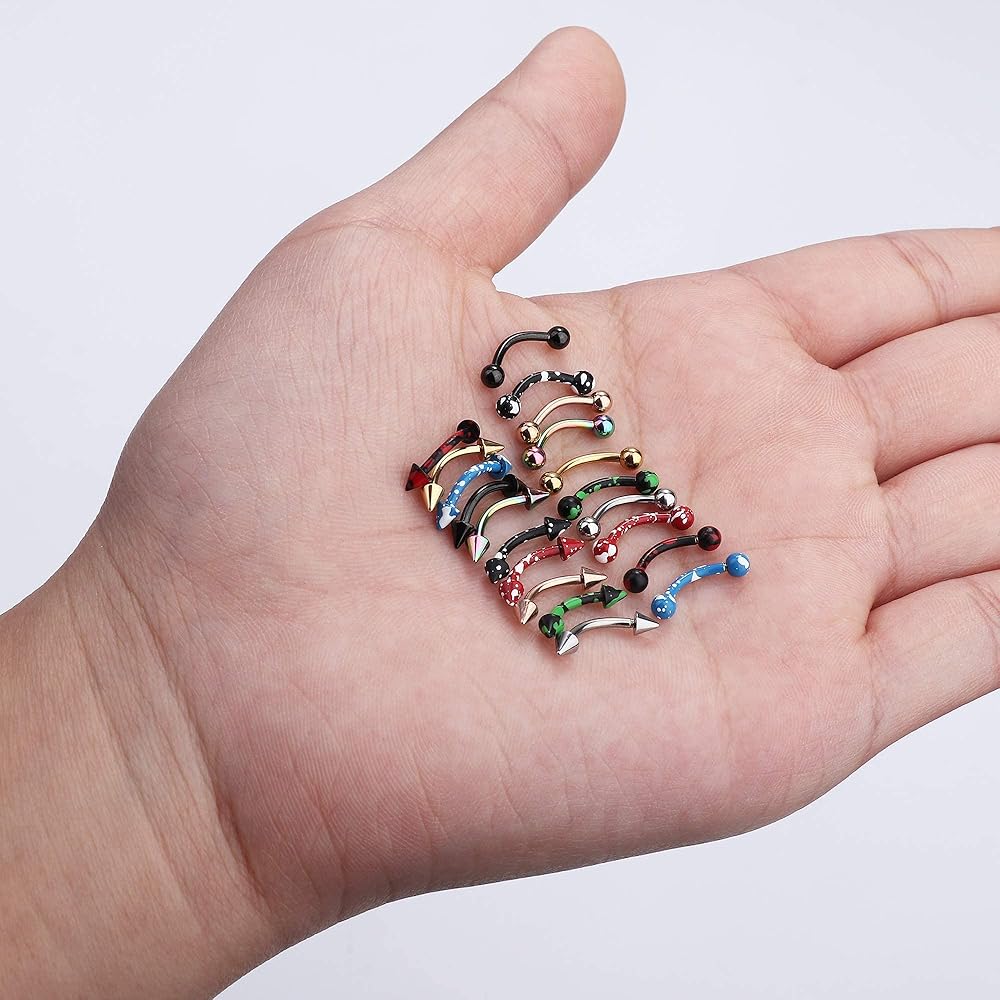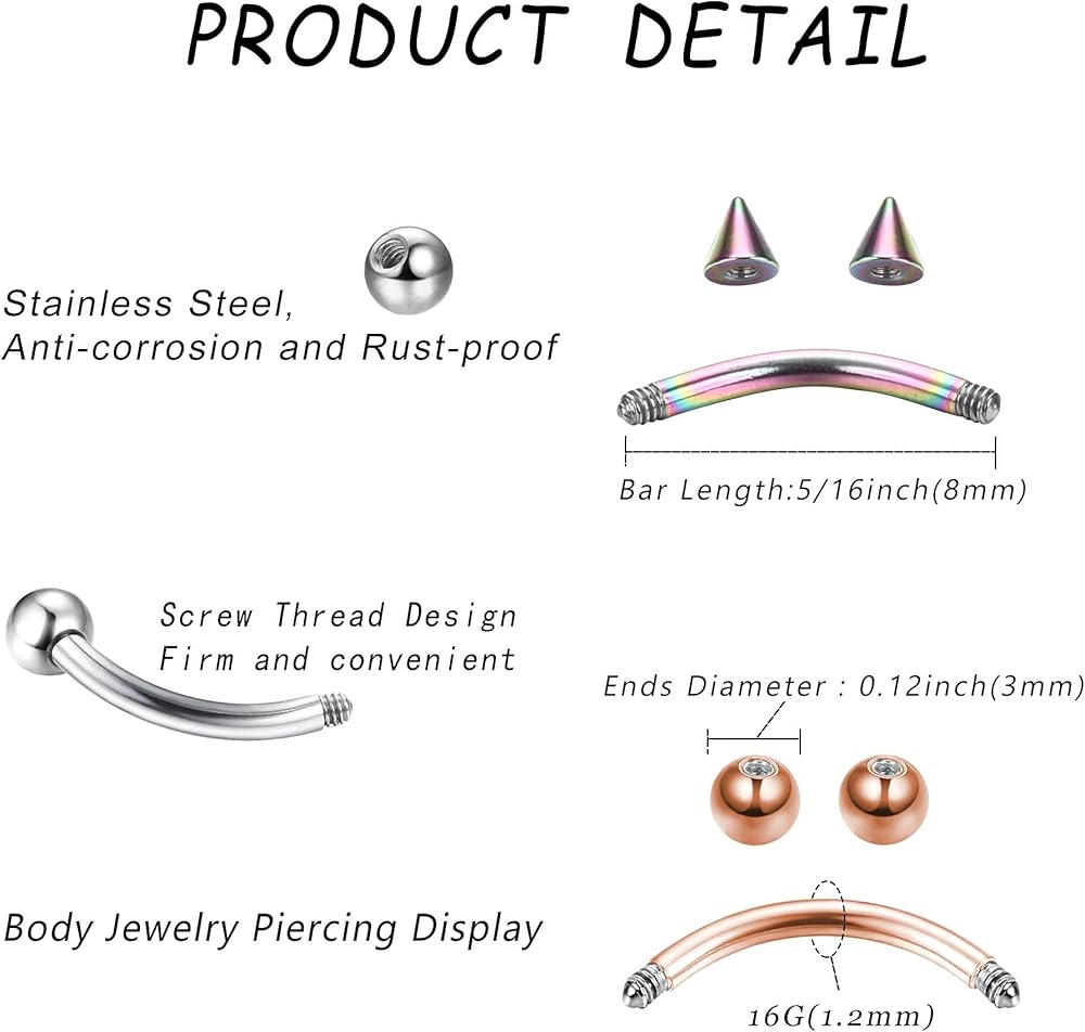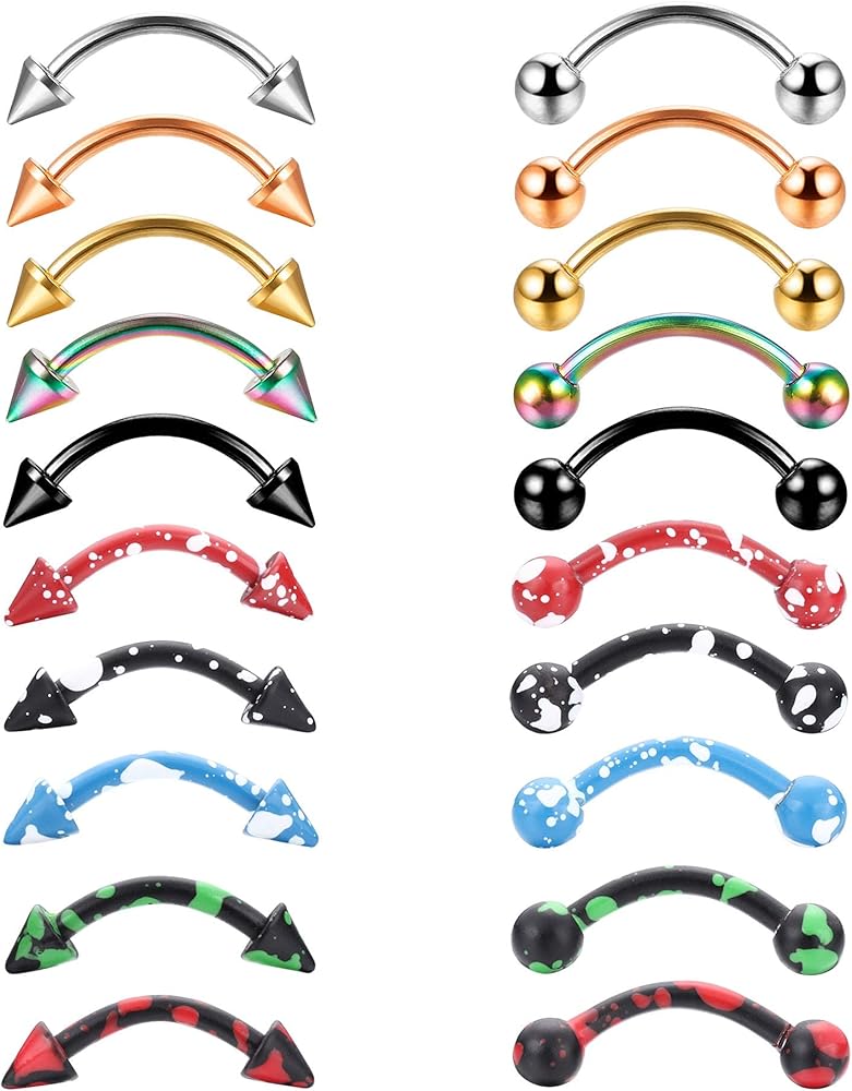 ❥ ITEM DISPLAY--You'll Get 20pcs Colorful Curved Eyebrow Barbell Rings In A Set,Half Ball Styles,Half Spike Styles.Follow With 5 Colors Tone :Silver,Black,Gold ,Rose Gold ,Rainbow.Designed For Those Who Love Body Jewelry Piercings,Suitable For Tragus,Helix,Lip,Hide Septum Barbell And So On.You can wear it on multiple parts or individually.