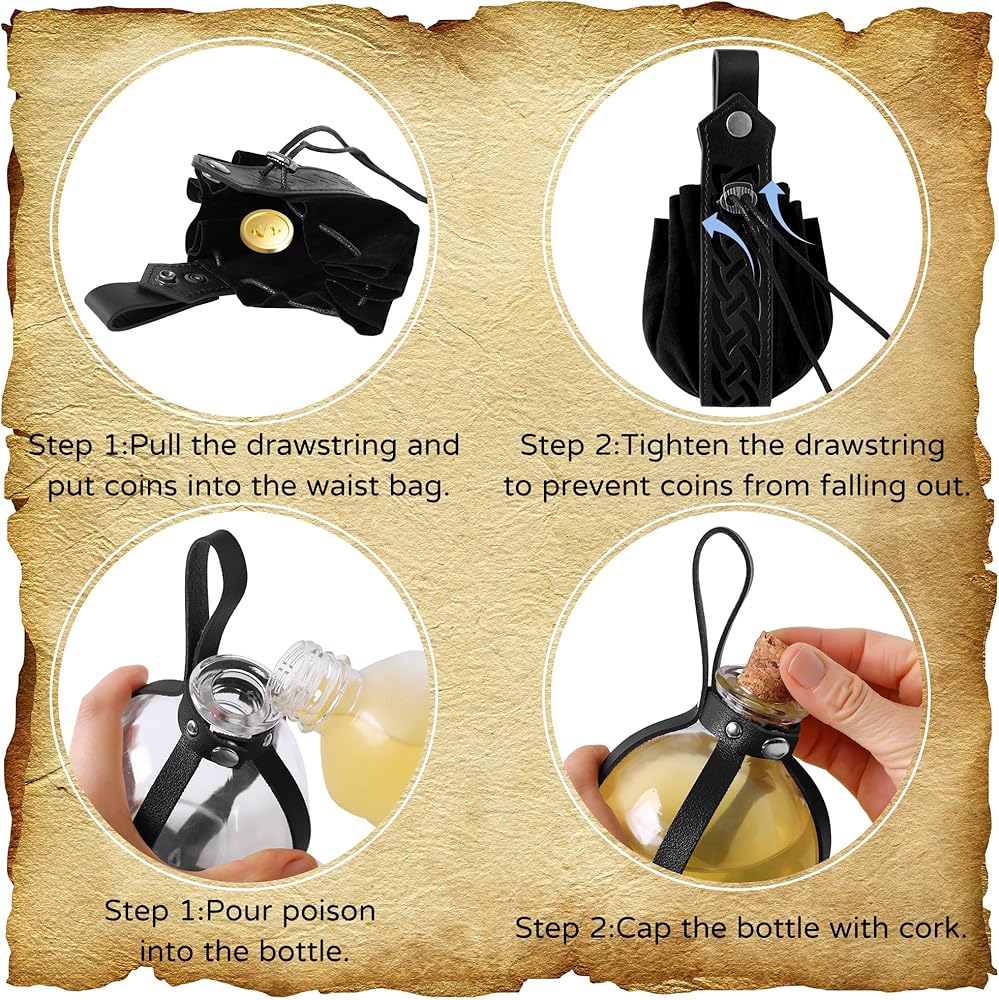Packing: This renaissance accessories set includes 1pcs renaissance belt,1pcs potion bottles with cork,1pcs belt pouch renaissance,2pcs skirt hike,1pcs bottle carry strap.These medieval accessories are so adaptable for making a costume look more authentic,ideal for attending a renaissance fair