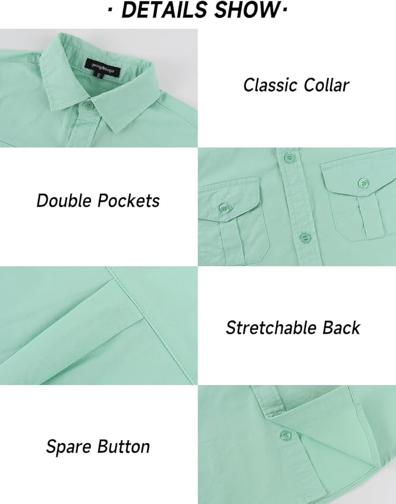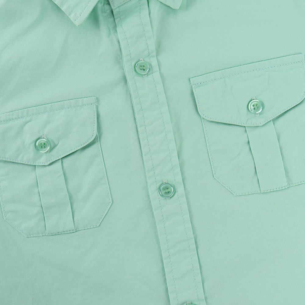 - Classic button-front shirt, button adjustable cuffs, classic point collar, two flap pockets with button closure, can store more small items