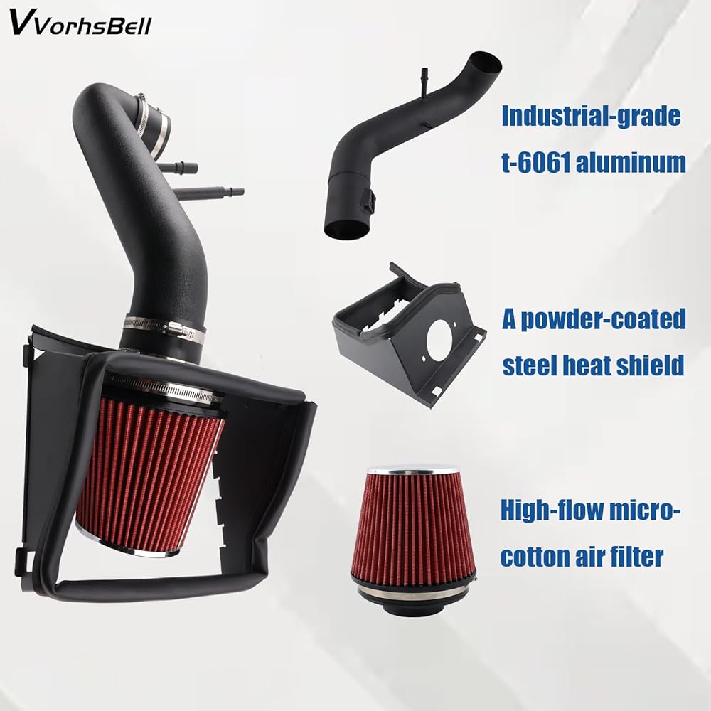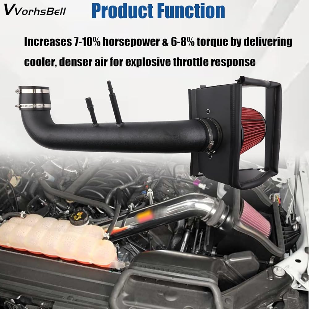 【Installation】Cold air intake kit f150 v8 5.0 motor includes air filter, intake tube, heat shield, and silicone connectors