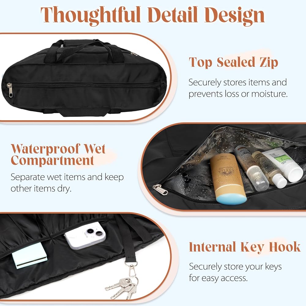 MULTI-POCKET TRAVEL TOTE BAG: Keep your belongings organized with this zippered beach bag. Total 15 compartments including 1 large main compartment, 4 interior open pockets, 1 interior zippered pocket, 6 exterior open pockets and 2 exterior zippered pockets and 1 large waterproof wet compartment