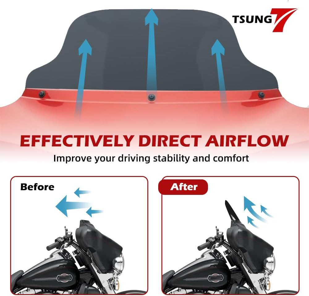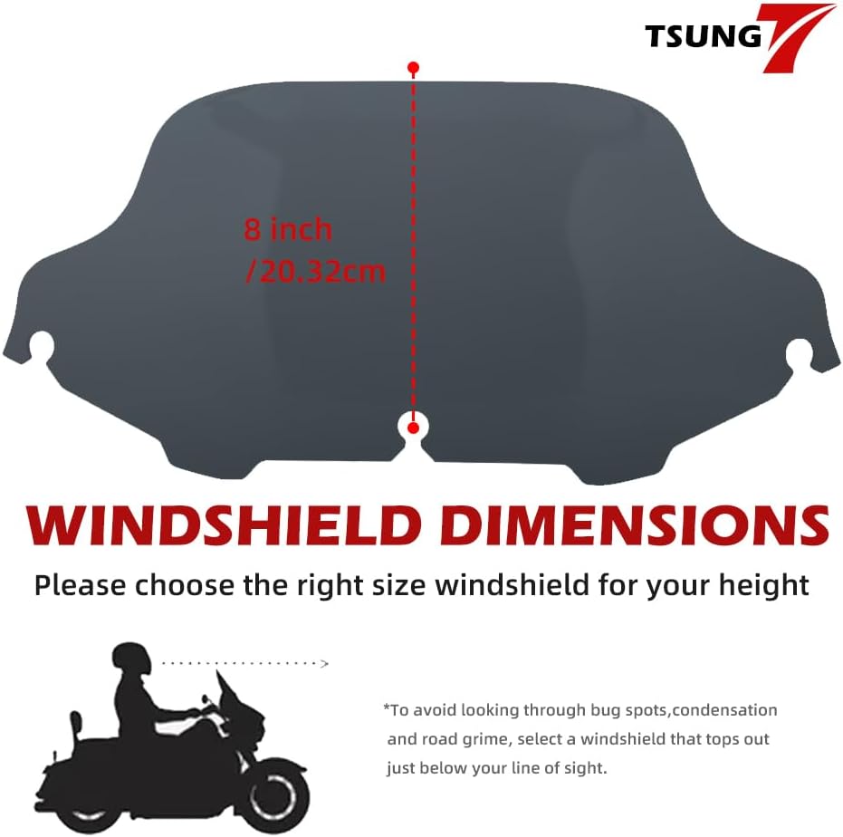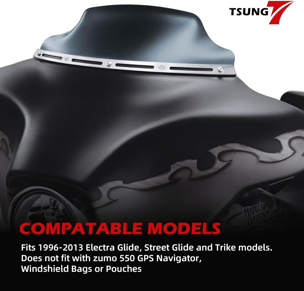 【FITMENT】The aftermarket 8 inch Black Windshield Compatible with Harley Davidson Touring Street Glide Electra Glide Trike 1996-2013 (NOT fit 2014-Later; NOT fit with zumo 550 GPS Navigator, Windshield Bags or Pouches. NOT fit Road Glide and Road King models)
