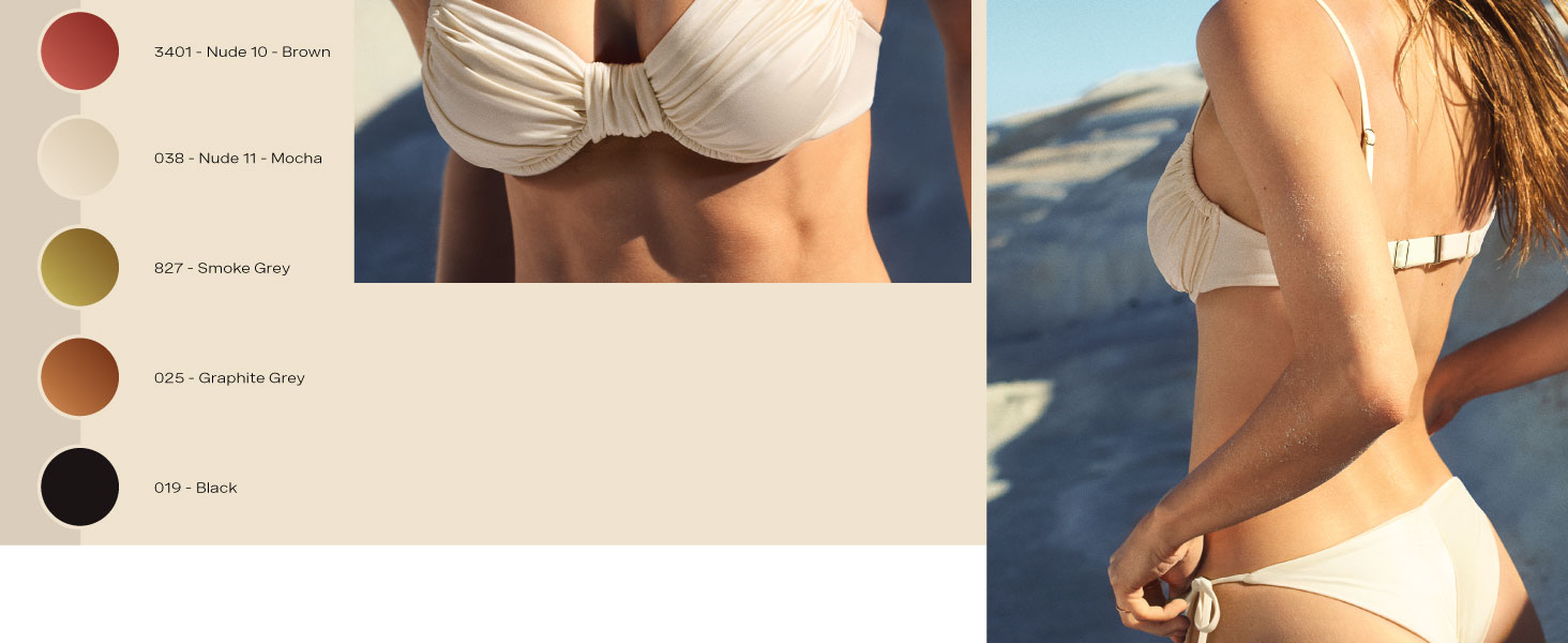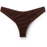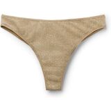 Fully lined Brazilian bikini bottoms. Made from refined shiny lamé fabric offering a bright and sophisticated effect. The slightly rounded waist at the front allows for wear with classic coverage or a higher leg, depending on your body shape.