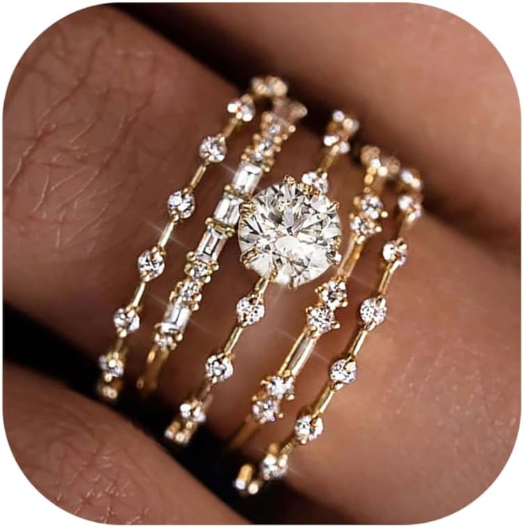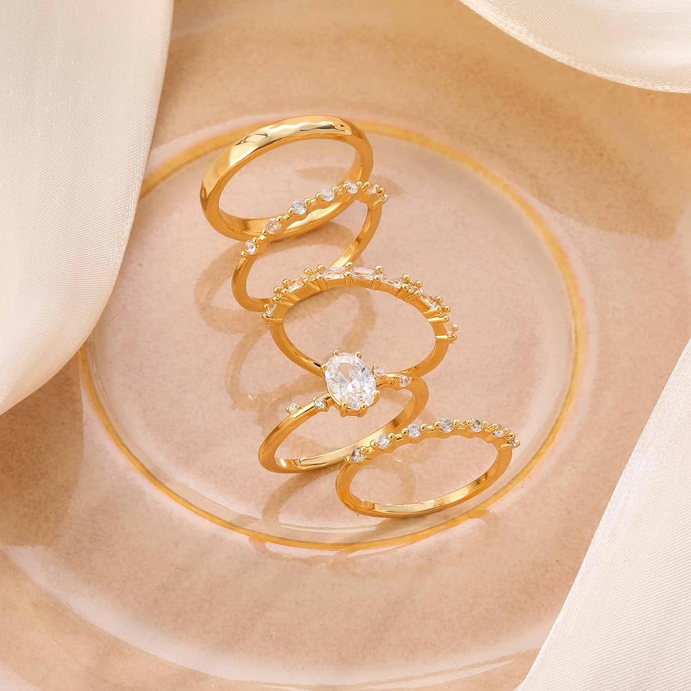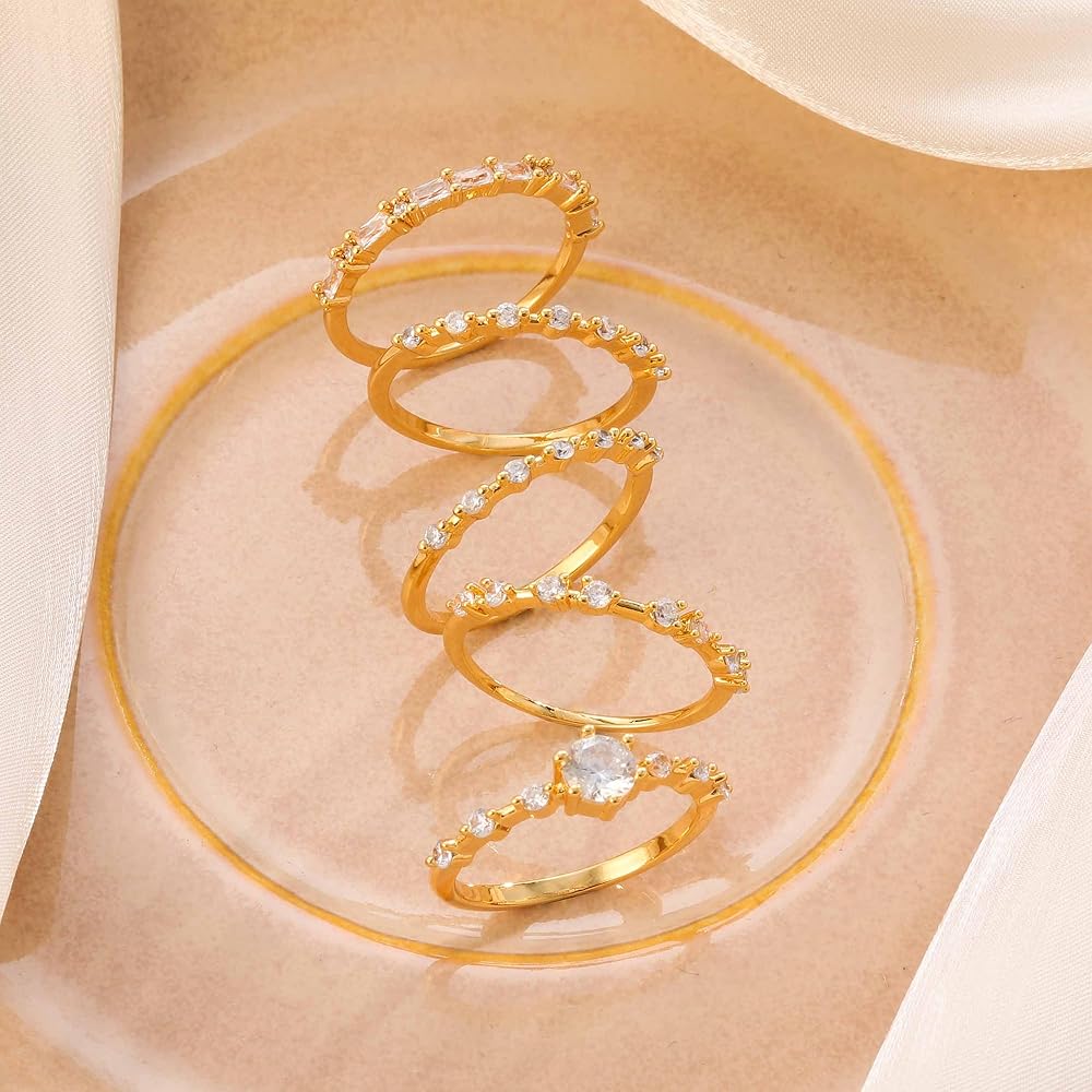 5PCS CUBIC ZIRCONIA RING SET: The stackable rings are made of high quality brass with cubic zirconia gemstones, high polish and 14k gold plated surface ensured durability and long-lasting shine. The non tarnish gold rings are lead -free nickel-free, hypoallergenic, and not easy to make your fingers green