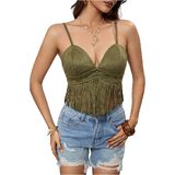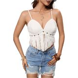 Design: V neck, sleeveless, spaghetti strap, backless, fringe trim, star-studded, cami crop top, cowgirl top for women western, boho style