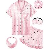 Adorable Design Meets All Her Dreams: These girls silk pajamas feature charming ruffled hems, playful prints or elegant solids, and a comfy button-down top. Each girls pajama set includes a silky eye mask, scrunchie, and headband—turning every night into a magical memory for birthdays, spa nights, or slumber party