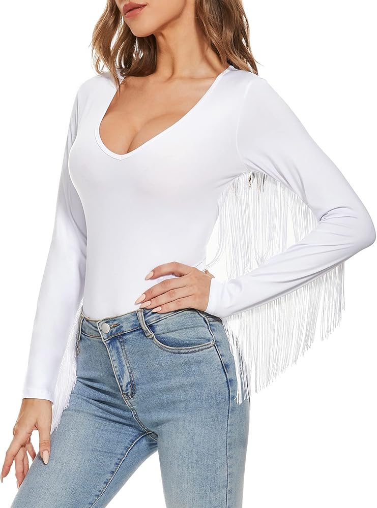 Design: long sleeve bodysuit top, sexy deep V-neck, snap closure. With fringe tassels embellishment and sexy collar design. V-neck design and elastic tight design can show your charming figure, both elegant and sexy. This unique design makes you the focus of the crowd. This long sleeve bodysuit is very suitable for music festivals. As Sexy concert outfits for women, it will bring you a great experience.