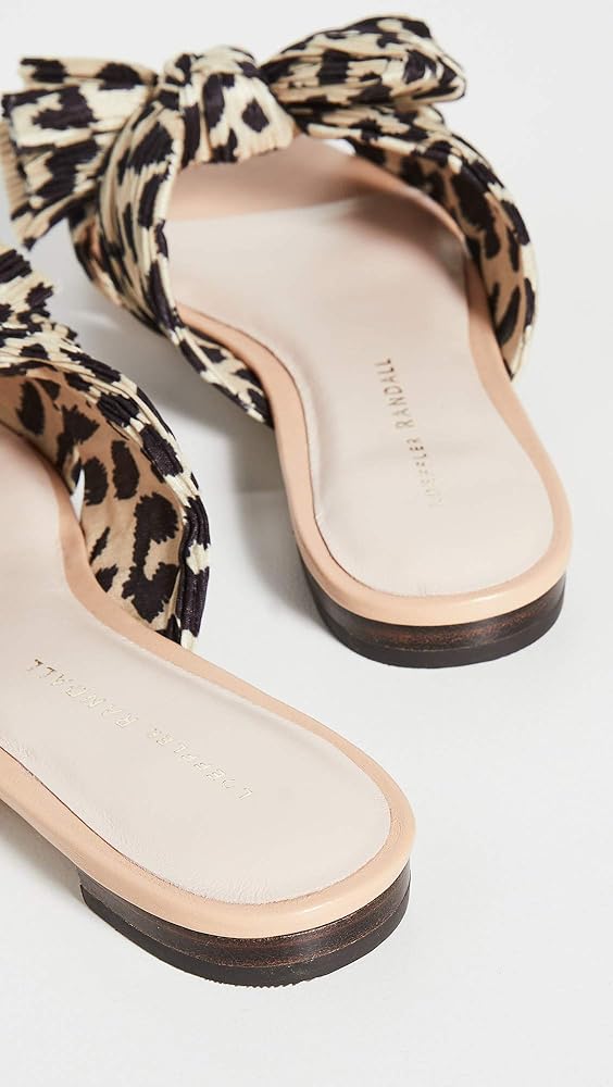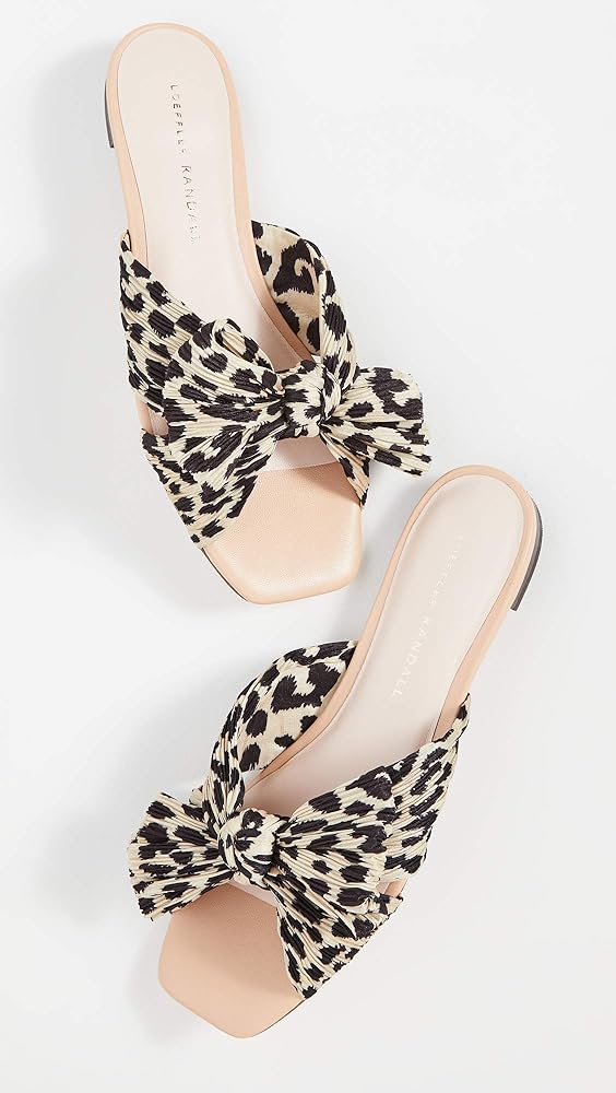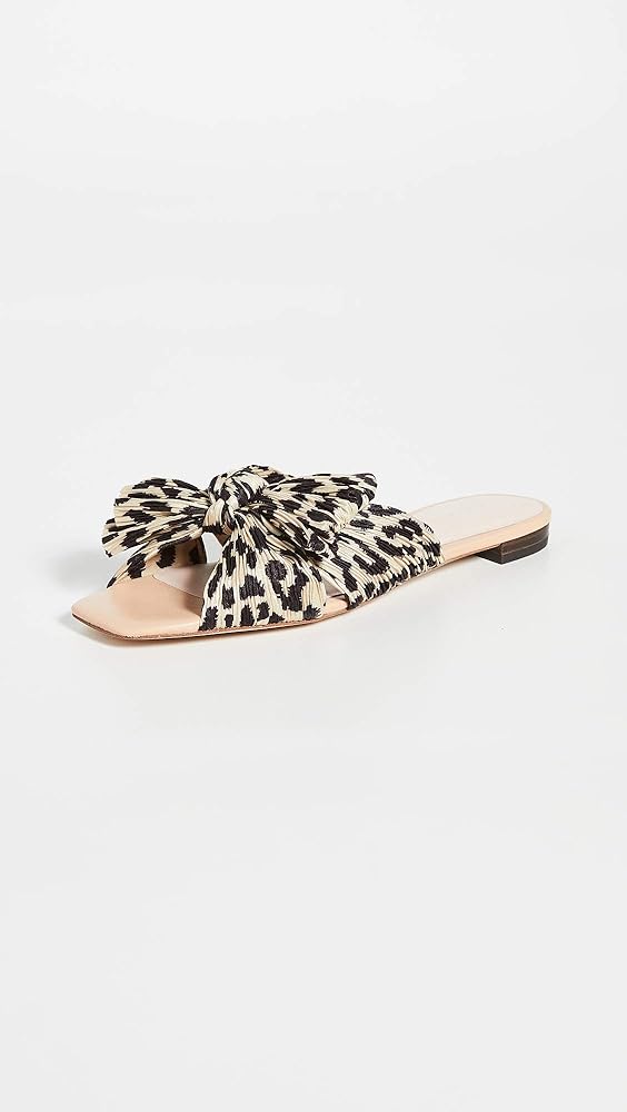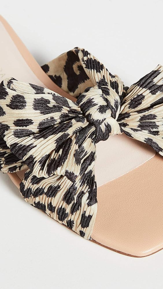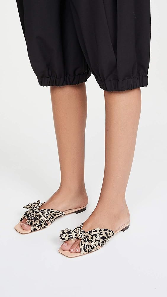 Pleated flat slide sandal topped with our signature knotted bow. Features a padded footbed with gold stamped logo and an open, squared toe. Slips on.