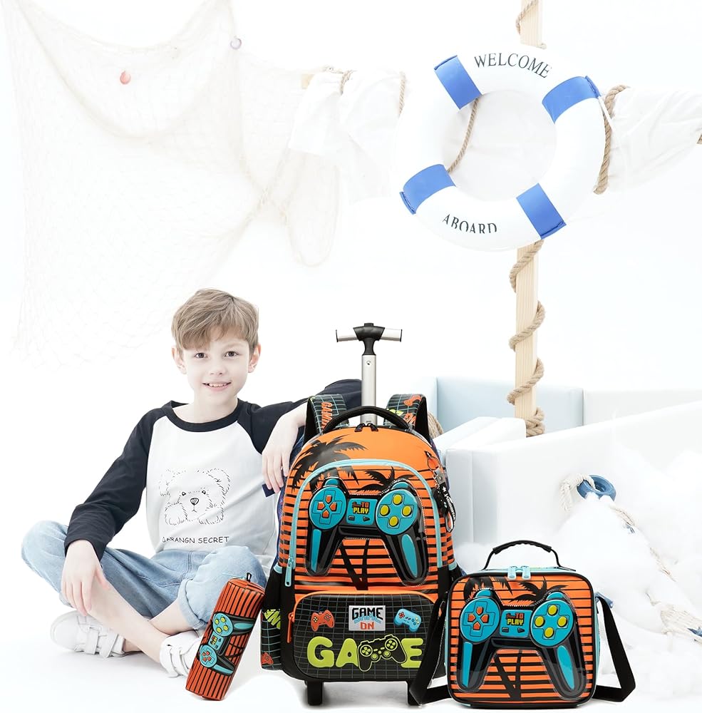 [Kids Rolling Backpack Size]This rolling backpack set includes a rolling backpack(16.5"X11.8"X7.8"),lunch Bag(9"X8.2"X3.9"), and a large-capacity pencil case(9"), perfectly designed for school days, family trips, or weekend adventures. Ideal for organizing books, snacks, art supplies, and clothes for kids aged 5-12.