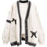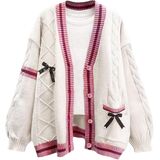 V-neck, long sleeves, color block, separate bowknots, ribbon decoration, twist cable knit, wide ribbed knit cuff and hem