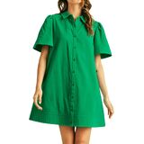 Summer solid color dress for women is designed with relaxed silhouette, turn down collar, 2 side pockets, contrast thread seam detail on wide short sleeves and skirt hem, simple yet stylish