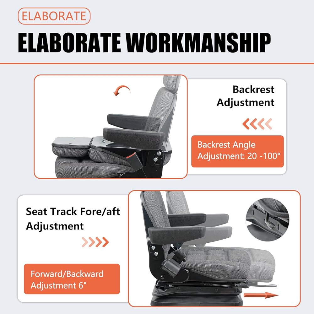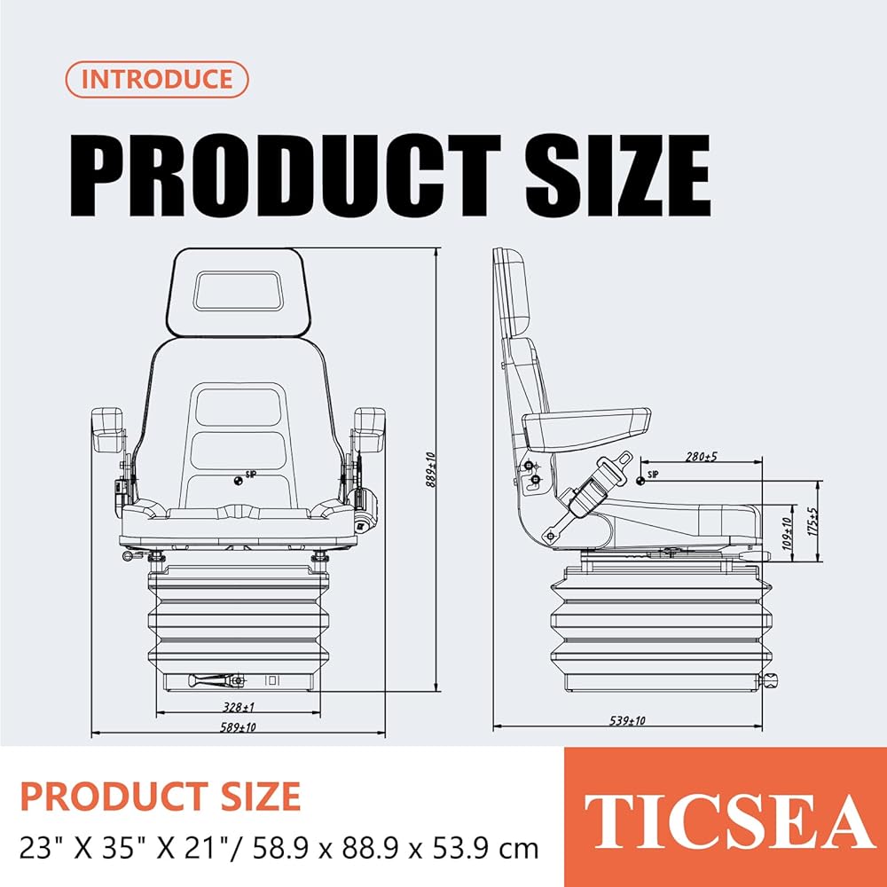 Whatever you can imagine,we've got it for you. Our seat its comfortable and very robust construction. The seat requires no maintenance intervals. Install our seat, drive off and waste no more worries. The base plate has various mounting holes: In width (from left to right), the mounting holes have a distance of 260 mm. Various holes are specified in depth, from 136 mm to 325 mm. (It is also possible to drill other mounting holes.) Technical details: Mechanical sprung seat Extra strong scissor suspension. Backrest foldable. suspension Adjustable height to 3 different positions. Height adjustment: 60 mm. Height from base plate to seat cushion top edge 310 mm -370 mm Sspension travel: 80 mm. Weight adjustment: 50 to 130 kg. Longitudinal adjustment 176 mm,each step 16mm. The backrest fold down. Armrests can be tilted - height adjustable and folded. Interchangeable covers and pads Lap belt mounting points according to DIN standard. Seat pad width: 525 mm. Extra thick padding. Width with armrests: 615 mm. Mechanical lumbar support. Retractable seat belt. Contains Operator pressure sensor. TICSEA has more than 20 years of seat manufacturing experience and provides solutions for global seats.Welcome to consult.24-hour online customer service, we provide 100% quality service. Packing: 1*Seat