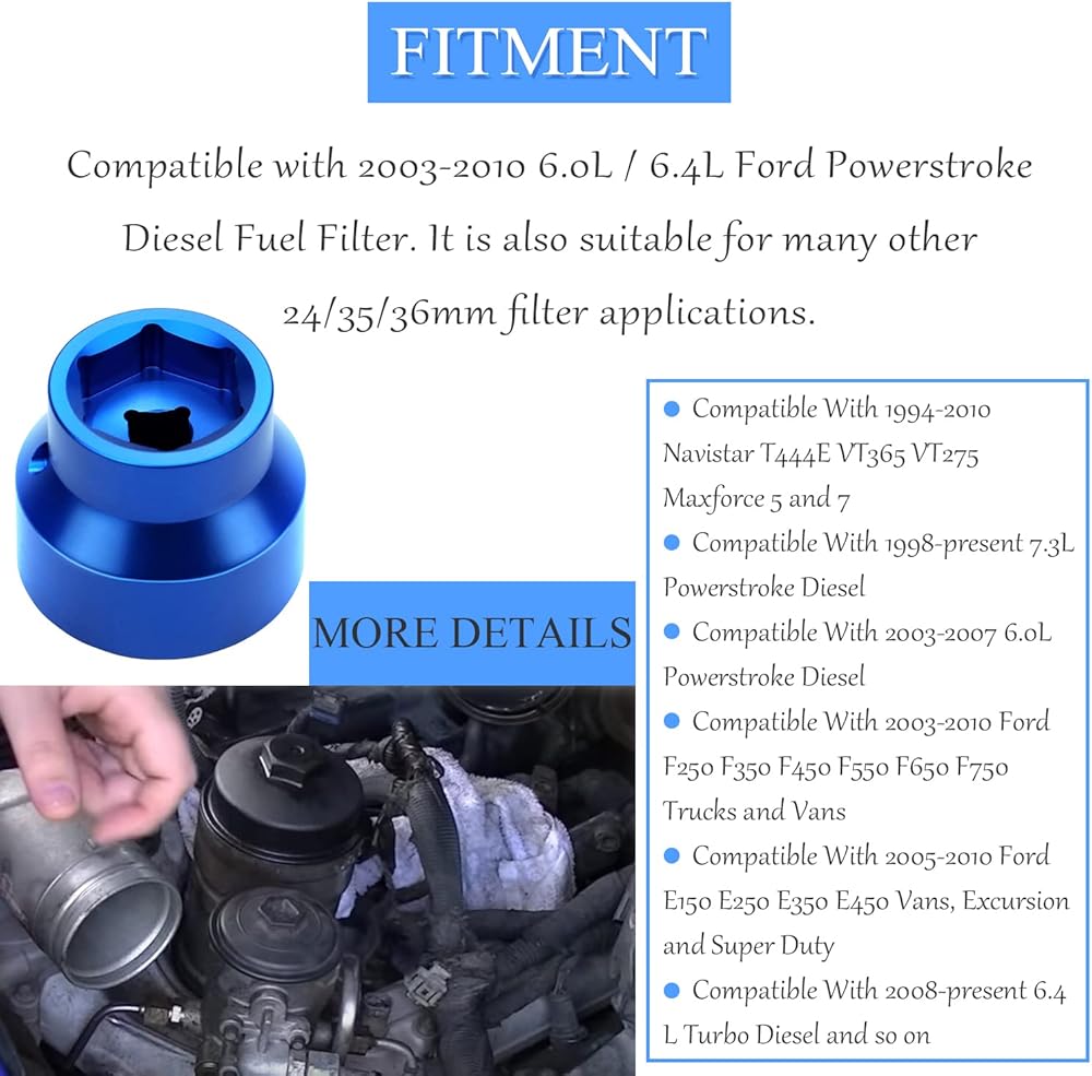 【Fitment】- Compatible with 2003-2010 6.0L / 6.4L Ford Powerstroke Diesel Fuel Filter. It is also suitable for many other 24/35/36mm filter applications.