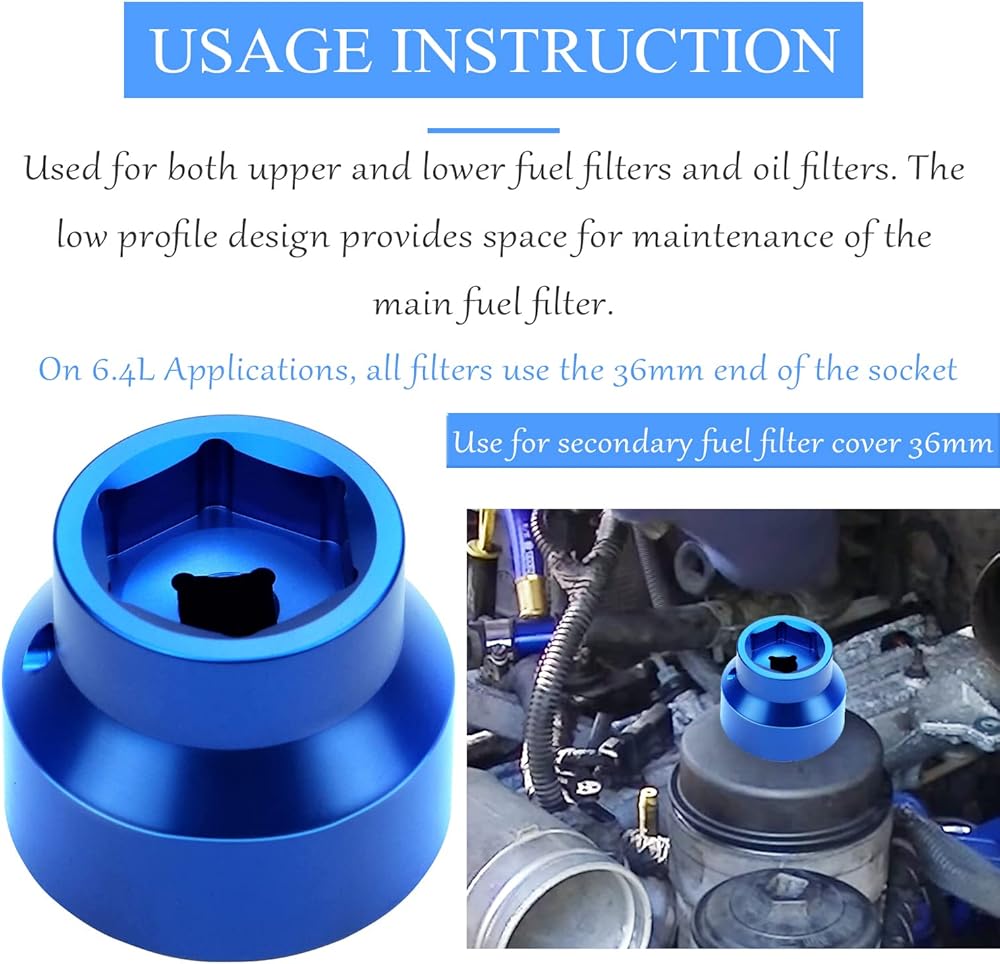 【Kindly Usage Instruction】- Combine with your stubby barrel(1.5 inches perfect match), 3/8 extension rod and 3/8 ratchet. The fuel fliter sleeve is reversible 24mm / 36mm. The main fuel filter cover is 36mm, and the secondary fuel filter cover is 24mm. (Kindly Note: On 6.4L Applications, all filters use the 36mm end of the socket).