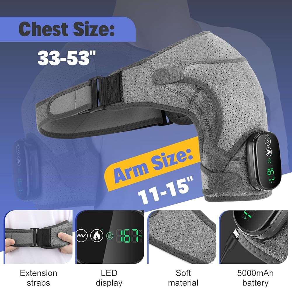 Adjustable Heated Shoulder Brace: Our heated shoulder pad can be arranged to fit either the left or right arm. Shoulder brace for women men. Adjustable size of shoulder heat wrap: chest circumference 33" to 53''; arm circumference 11'' to 15''. Furthermore, Heated shoulder brace comes with extension strap to solve the problem of size incompatibility