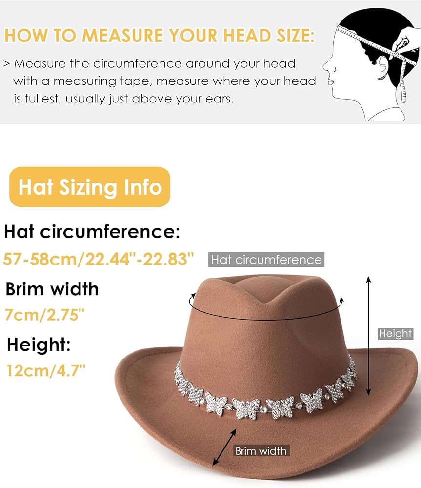 COWGIRL HAT SIZE: Felt hat circumference: 57-58cm/22.44-23.83", Brim Width: 7cm/2.75", Height:12cm/4.72" Made of 65%cotton,35%polyester. comfortable to all-day wear.