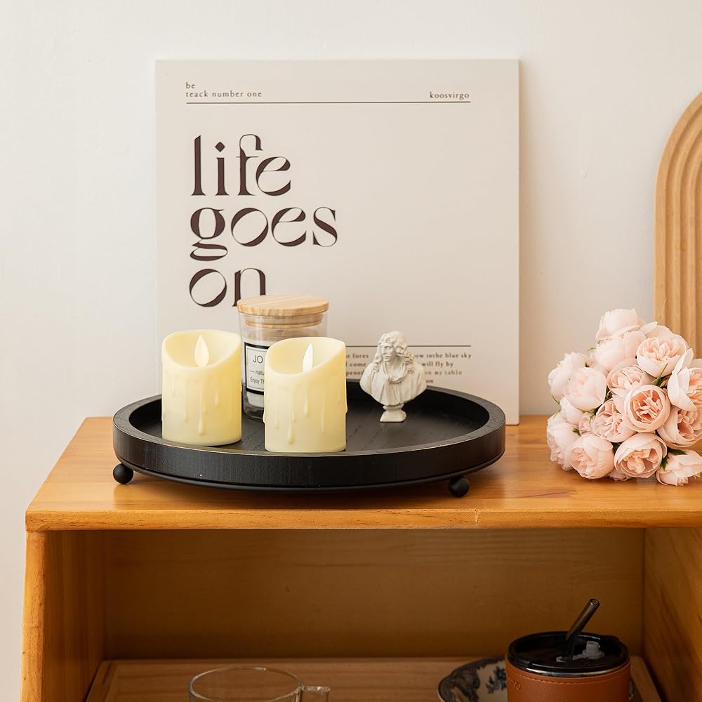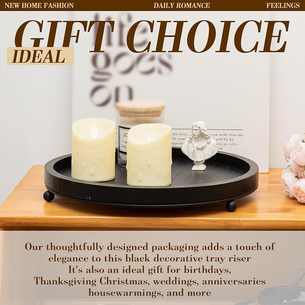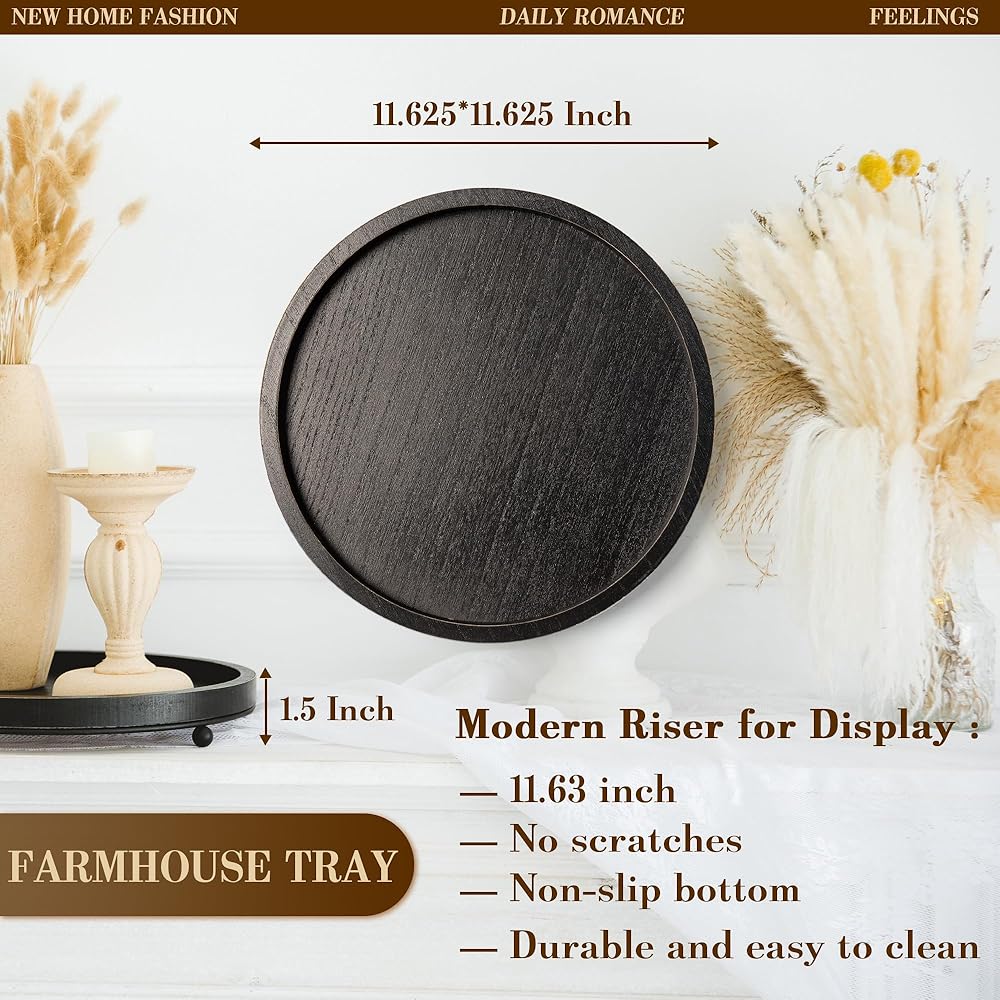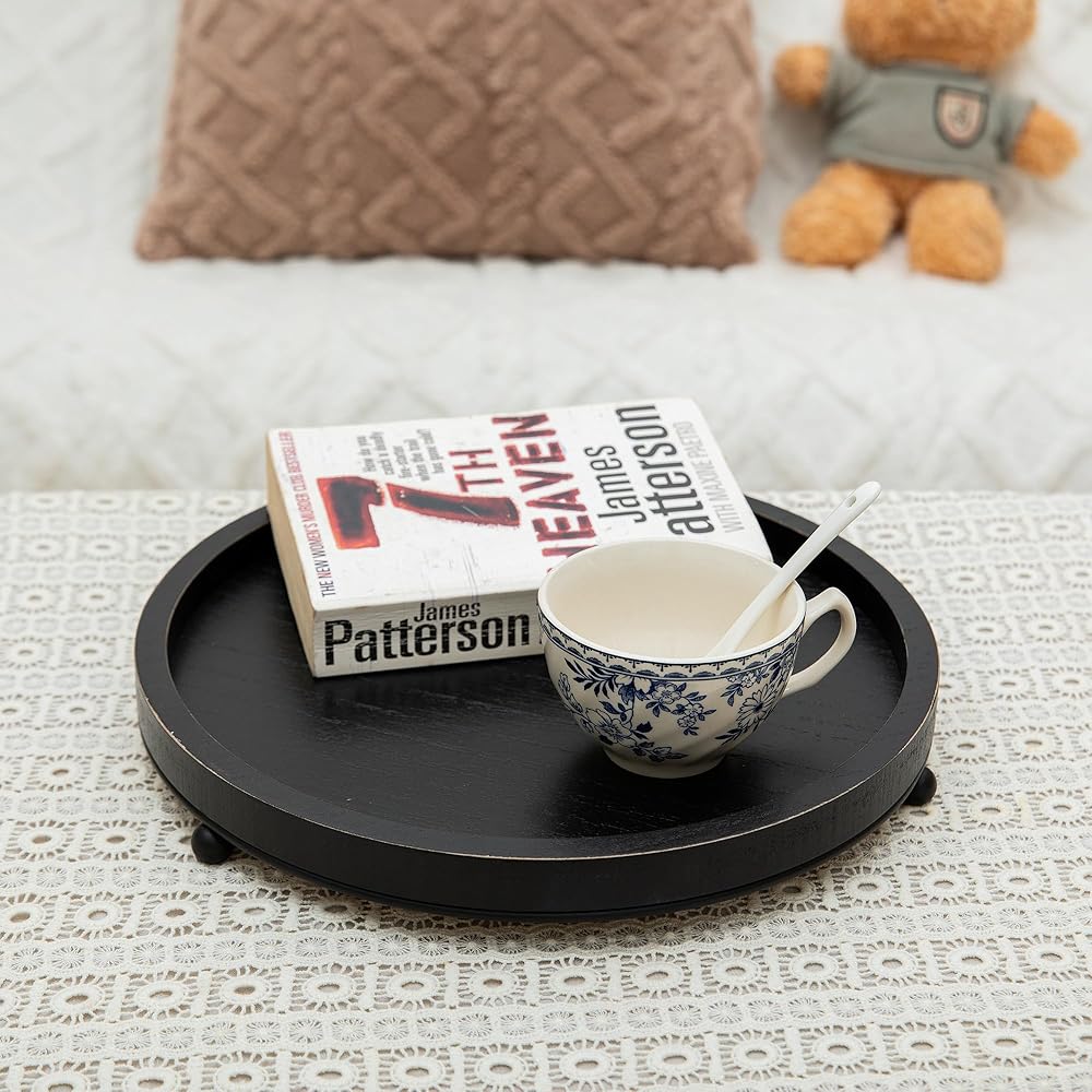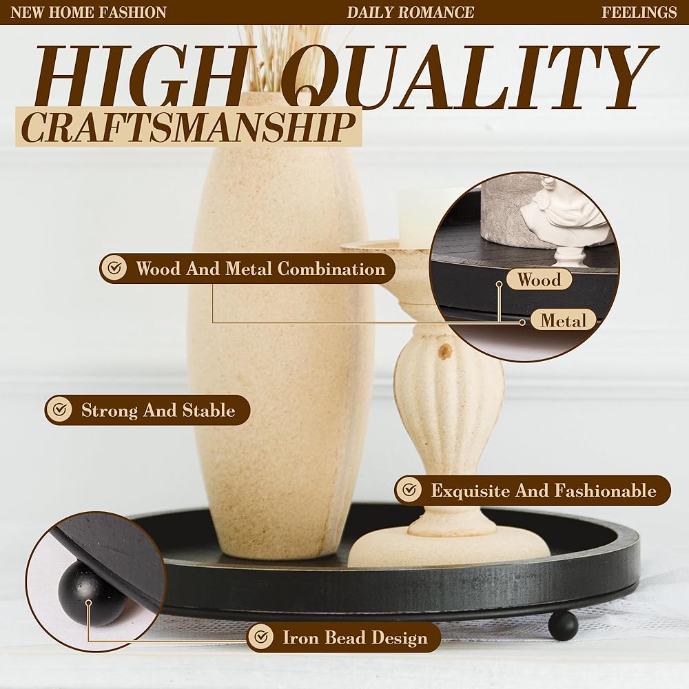 【Stable and Durable】: This round decorative tray is made of a mixture of high-quality solid wood and high-density composite wood, making it sturdy and durable. The three metal iron balls on the bottom are designed to provide stability while protecting your table from scratches. The rustic round tray has no strong chemical smell.