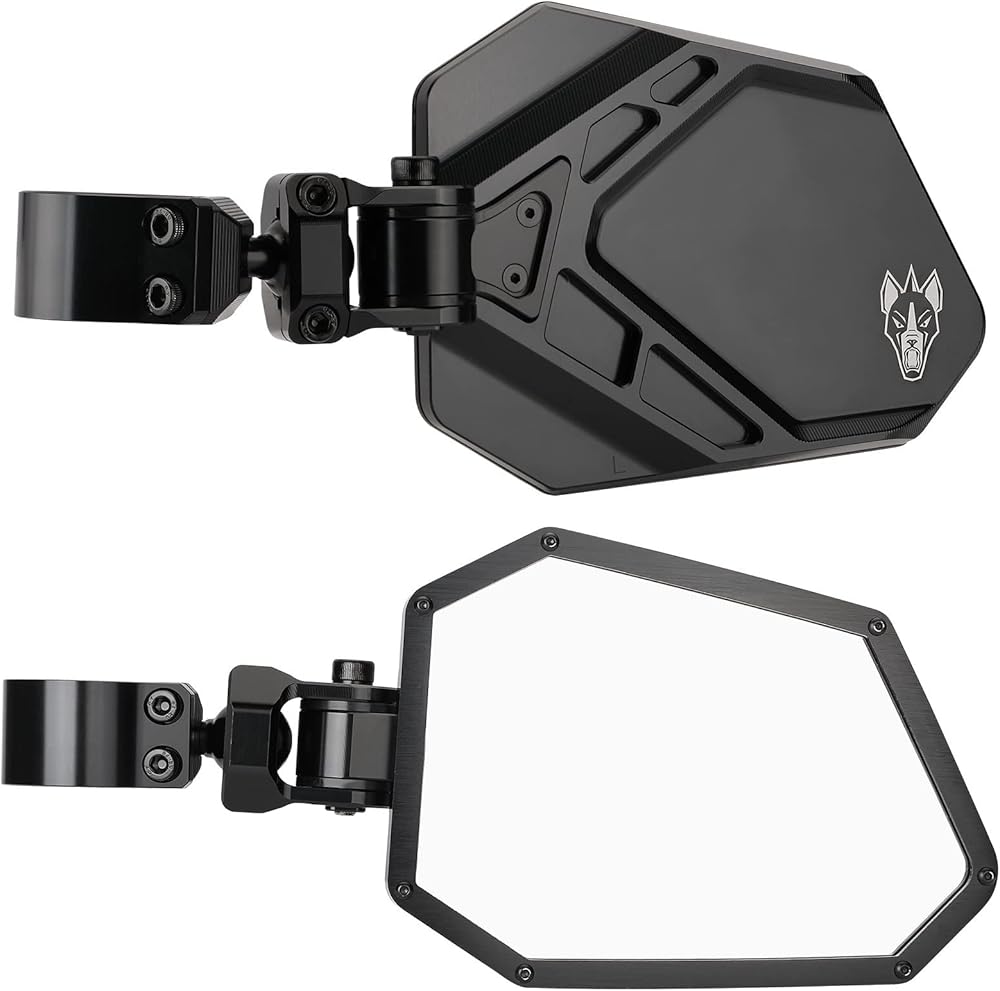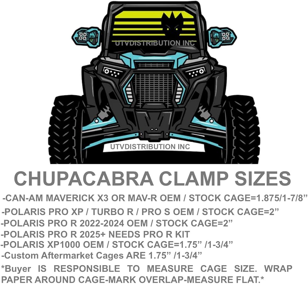 Chupacabra Offroad Cuero Pro UTV Mirrors (set of 2) THESE Mirrors are BADASS-Run these and get some made props!!!!!! The Cuero Pro offers a new stylish design with a larger viewing area, thanks to an increased size convex glass mirror. With an improved modular design using our proprietary clamp system, these mirrors also clear most windshields and window nets. Our Cuero Pros offer an adjustable, beefier design that integrates with our mounting system to run a pod light of your choice. Take advantage of the highest value side mirror set in the industry, which has only become more stylish and diverse! The new CNC Billet Cuero Pro Side Mirrors fly past the competition, and it's not even close. Choose the proper size clamps for your rollcage-You are responsible to make sure the right size is ordered. ****Measure the Outside diameter of your rollcage at the mounting location.**** Available in 1-1/2"-1-3/4"-1-7/8" & 2" clamps.