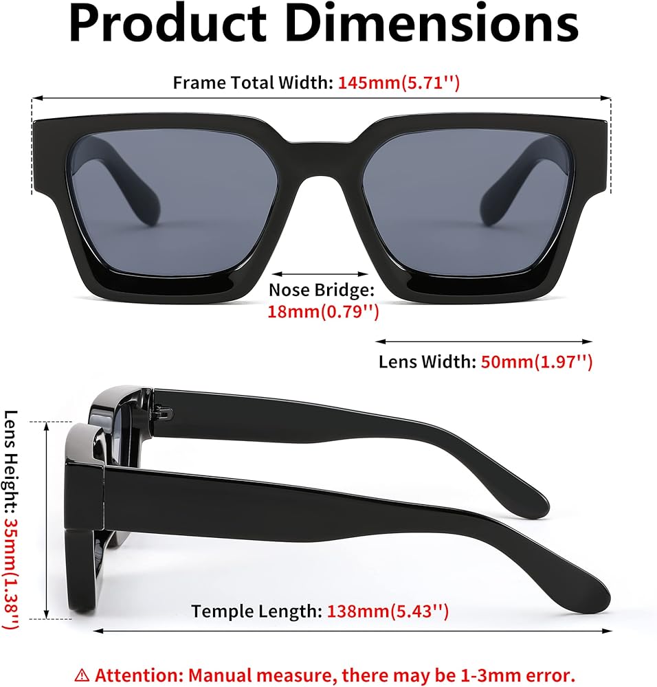 Product Dimensions -- Lens Width: 50mm(1.97''), Lens Height:35mm(1.38''), Temple Length: 138mm(5.43''), Nose Bridge: 18mm(0.79''), Frame Total Width: 145mm(5.71''). Attention: Manual measure, there may be 1-3mm error.