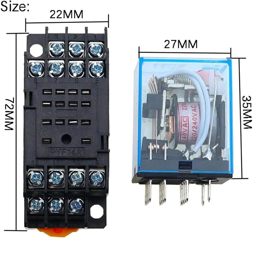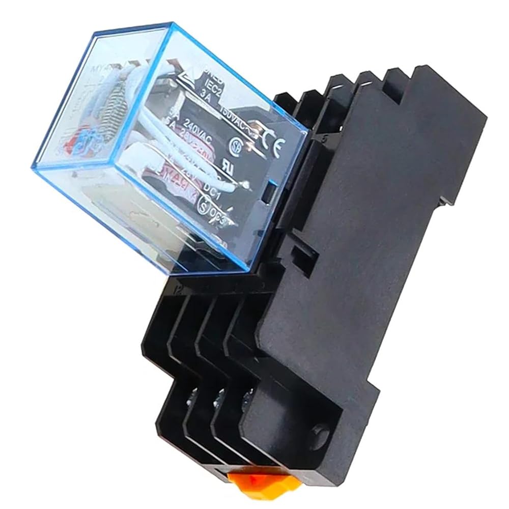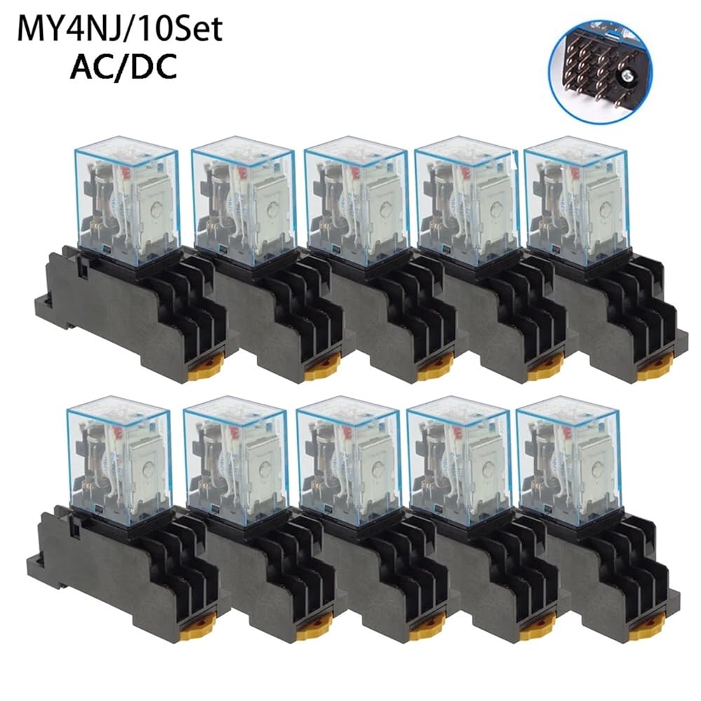ntroducing the MY4NJ Power Relay with Socket, a versatile and reliable solution for a wide range of electrical applications. This 10-piece set includes high-quality relays and matching sockets designed to meet diverse industrial and household needs. The MY4NJ model features a 4PDT (4 Pole Double Throw) configuration, offering 4NO (Normally Open) and 4NC (Normally Closed) contacts, ensuring flexibility and efficiency in power management. Each relay operates with a coil voltage range of DC/AC 12V, 24V, 36V, 48V, 110V, and 220V, making it compatible with various power sources. The contacts are rated for 5A at 240V AC and 5A at 28V DC, with a maximum rated current of 10A, providing robust performance for both low and moderate power applications. The LED indicator offers real-time feedback on the relay's operational status, enhancing user convenience and safety. Constructed with a silver alloy contact material, these relays ensure excellent electrical conductivity and longevity, boasting an electrical life of over 100,000 operations. The epoxy protection feature adds an extra layer of durability, safeguarding the relay against environmental factors and ensuring stable performance across a wide temperature range of -25°C to +55°C. The relays are designed for easy installation and compatibility with standard 35mm DIN rails, making them suitable for both new setups and upgrades. The package includes 10 power relays and 10 sockets, providing ample components for multiple projects or replacements. With a compact size of 3.4 x 2.7 x 2.1 cm for the relay and 6.8 x 3 x 2.9 cm for the socket, these components are space-efficient without compromising on functionality. Ideal for general-purpose applications, the MY4NJ Power Relay with Socket is a dependable choice for professionals and hobbyists alike.
