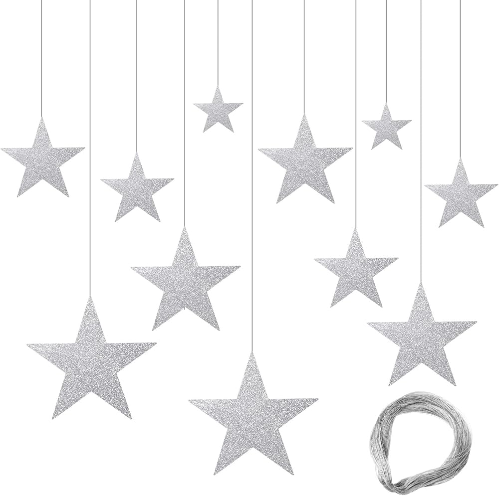 【Sufficient Quantity】You will receive 24 double-sided hanging stars decorations in four different sizes: 6cm/2.4in, 12cm/4.7in, 20cm/7.9in, 30cm/11.8in2, and a matching set 50 m/19.68 inch nylon rope