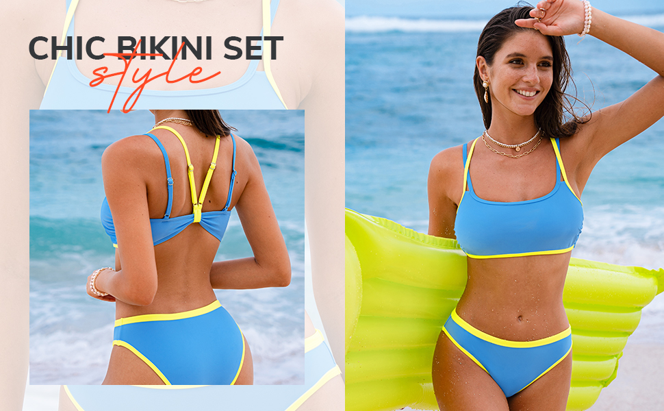 Design: The bikini set two piece bathing suit swimsuit features a bold colorblocking style, square neck top with adjustable double straps for added allure. The standard rise bottoms feature a timeless standard leg cut and classic bum coverage, ensuring both comfort and effortless style.