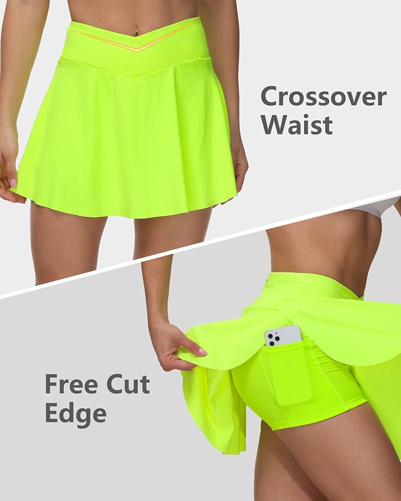 【Premium Material & Cross Waist Design Tennis Skirts】 Moisture wicking, 4 way stretch and non see-through fabric features comfortable and breathable, Lightweight, No pilling, Shrink resistant. The fashion athletic skirts are crafted with a V crossover high waist design to smooth your belly out and accentuate your waist and hips curve.