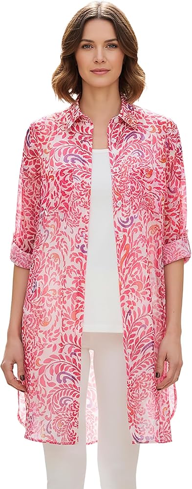 The season's must-have longer length tunic. Long sleeves adjust to three-quarter length with button tabs. Front chest pockets. 12" side slits. Back inverted pleat. 37" front; 40" back Poly/georgette Machine washable Imported Style & Fit Tips: This is the tunic you'll love to live in. From its comfortable and flattering fit to its polished shirt collar and modern hi-low hem, there's no question as to why this top will soon become your new go-to. Ease over everything from jeans to leggings for an on-trend look perfect for everyday.