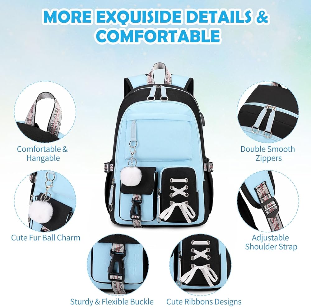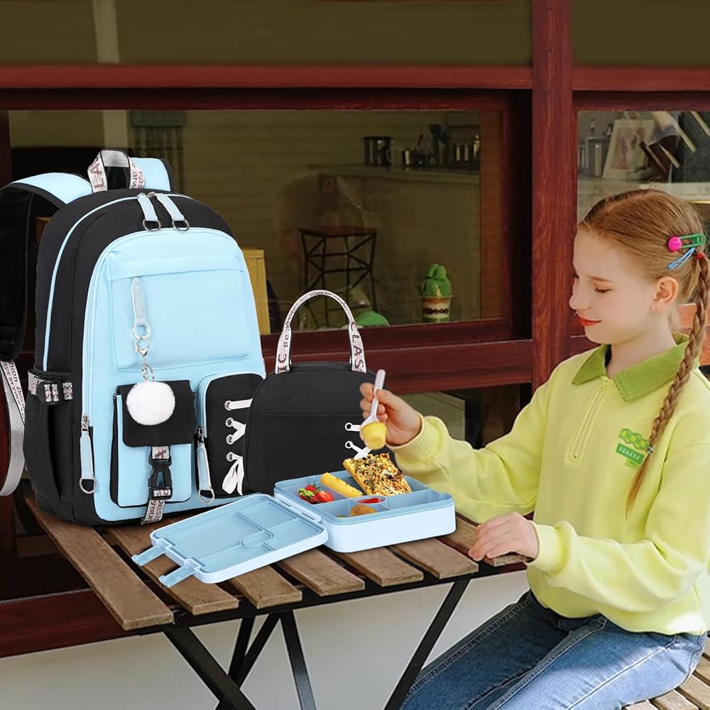 【PERFECT FOR ANY OCCASION】This backpack for teen girls set is tailored to meet the needs of young girls attending elementary, middle, or high school. Additionally, it exquisitely complements various outdoor activities such as travel, camping, and hiking. What's included? A stylish designed backpack for girls with a cute furry ball, a bento box, a lunch bag, a pencil bag, along with our worry-free 12-month warranty and super-friendly customer service. Recommended Age: Over 3 Years Old.