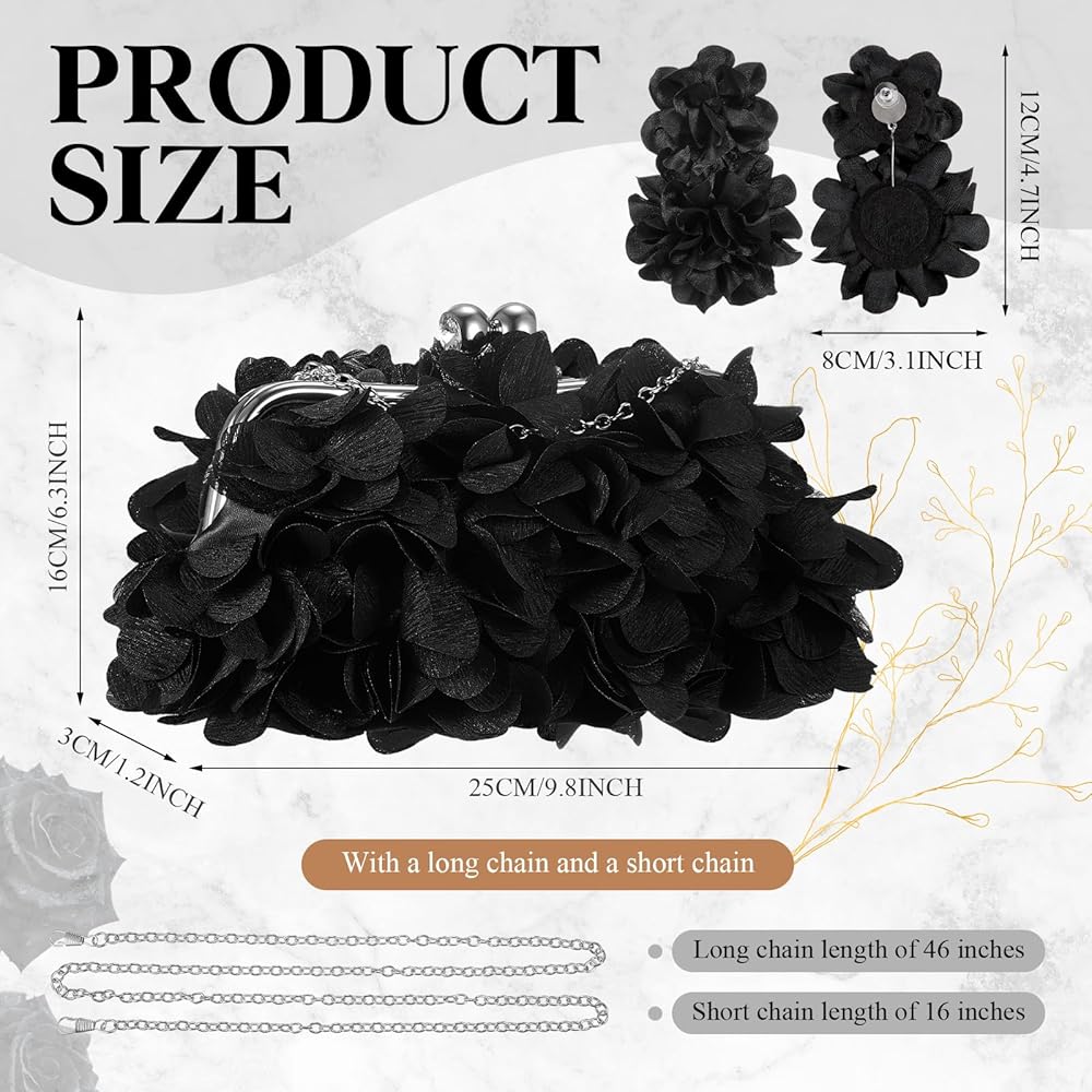 2-Piece Floral Ensemble: this 2-piece set featuring an elegant flower clutch purse and petal earrings; The women flower clutches evening bags boast ideal dimensions of 9.8 x 6.3 x 1.2 Inch/25 x 16 x 3 cm, making it a compact and portable evening purse; The accompanying flower earrings sized at 4.7 x 3.1 inch/12 x 8 cm, perfectly complement the elegant clutch purse, ensuring you make a chic statement wherever you go