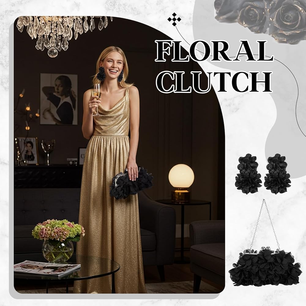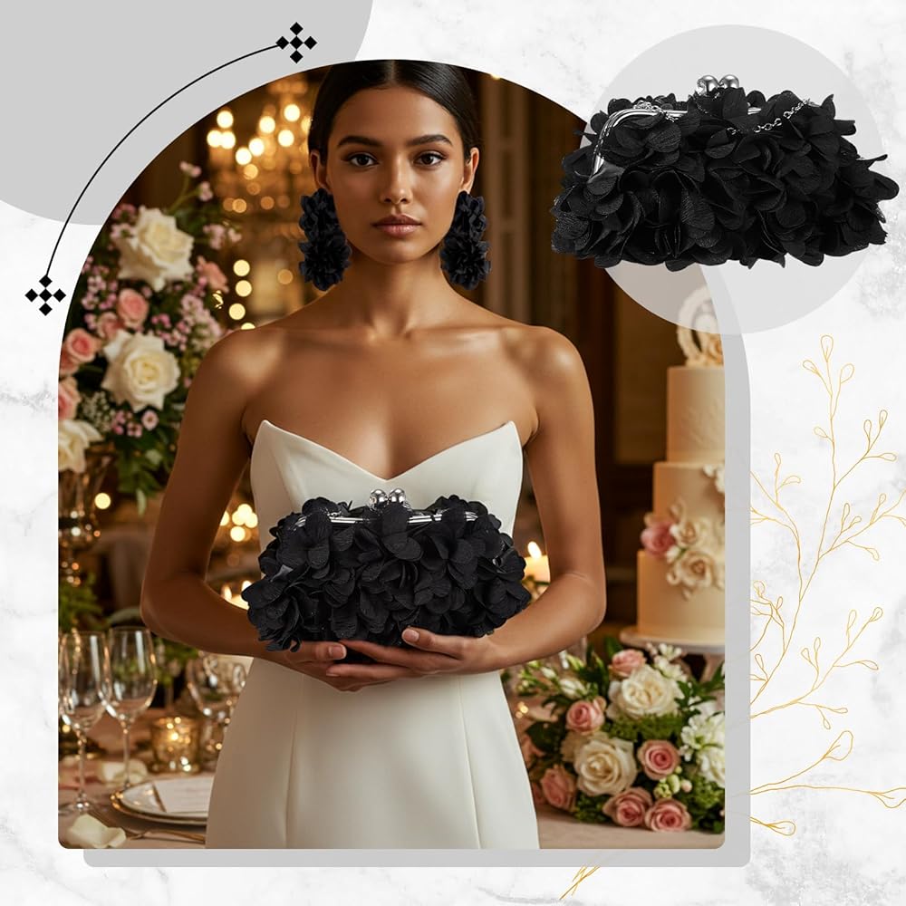 Beautiful Design: the exquisite design of this women flower clutches evening bag set showcases a seamless blend of classic floral elements; With its timeless solid color, the evening purse and floral earrings complement each other beautifully, making your ensemble fashionable and versatile for any occasion