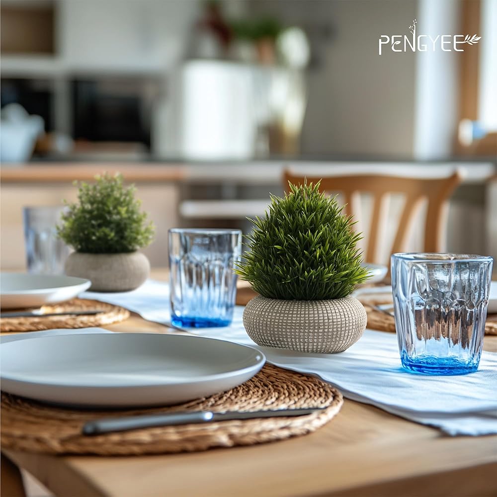 UNIQUE DESIGN : The PENGYEE 2Pack small fake plants for bathroom decor that are in two assorted concrete pot. The concrete ceramic pots with both traditional art characteristics and modern aesthetic charms, simple but fresh, more elegant in appearance and better in quality. This small artificial plants indoor/outdoor arranged together or separately, will add a natural, earthy touch to any space