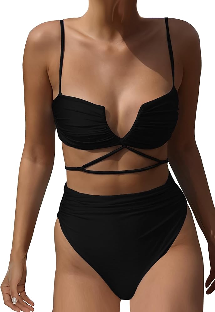 👙Style: High waisted bikini swimsuit for women, features v-wired top, paired with sexy ruched high cut bottom, make you more charming.