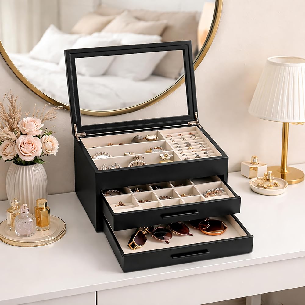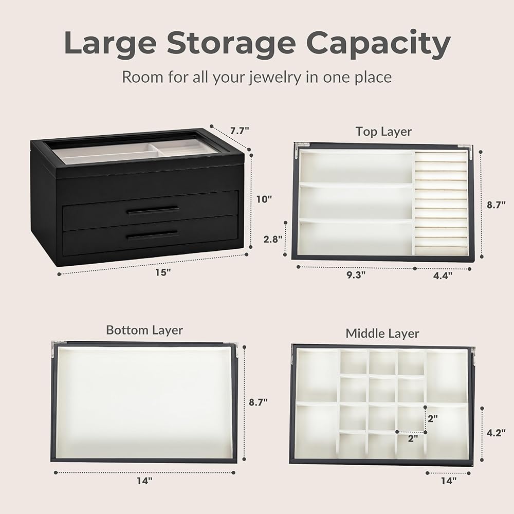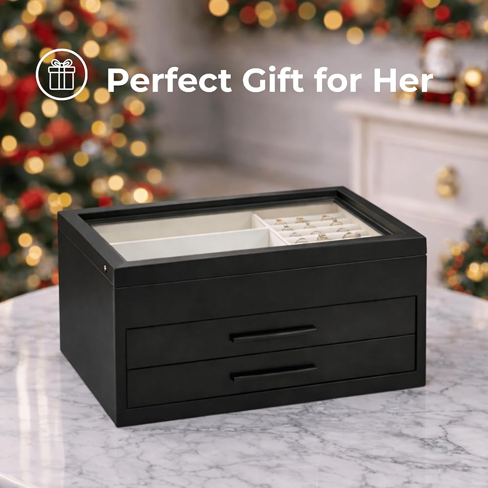 Elevate your jewelry storage with this sophisticated white jewelry box featuring a modern design with bronze-toned hardware accents. The clear glass top provides easy visibility of your treasured pieces while protecting them from dust. The thoughtfully designed interior includes specialized compartments for rings, necklaces, and other accessories, ensuring your collection stays organized and tangle-free. Two smooth-gliding drawers offer additional storage space for larger pieces or less frequently worn items. The clean lines and neutral finish make this jewelry box a versatile addition to any dresser or vanity. The sturdy construction and quality materials ensure durability, while the soft interior lining helps prevent scratches on your delicate pieces. Perfect for both everyday organization and safekeeping of cherished jewelry pieces, this elegant storage solution combines style with practicality.