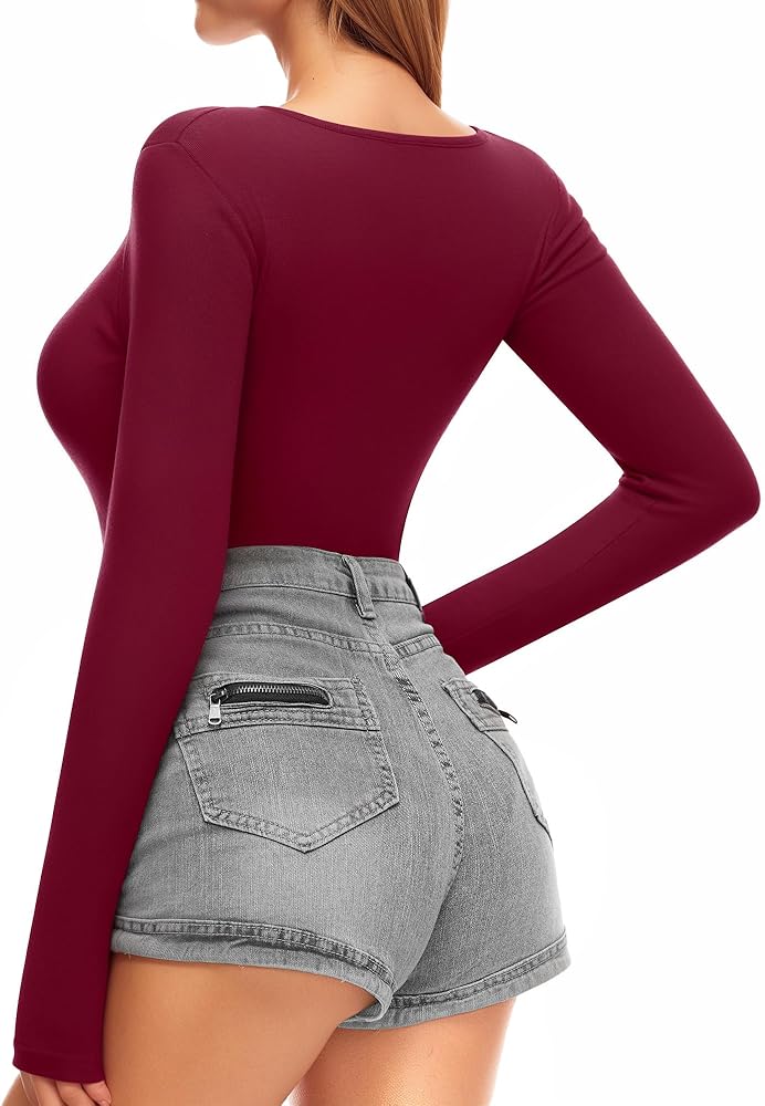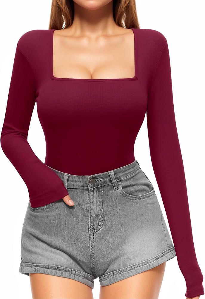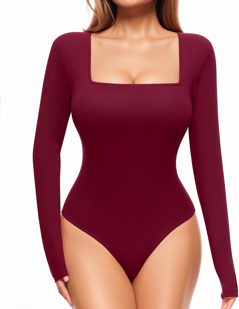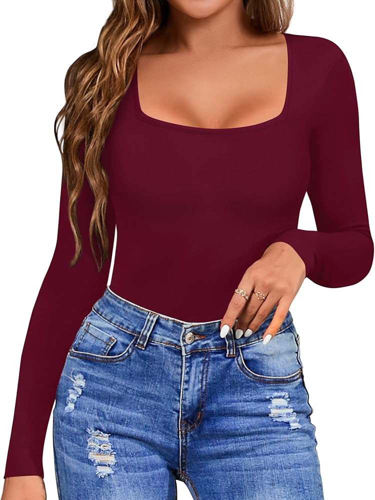 ALGALAROUND Women's Square Neck Long Sleeve Bodysuits Basic Slim Fit Tops Jumpsuits