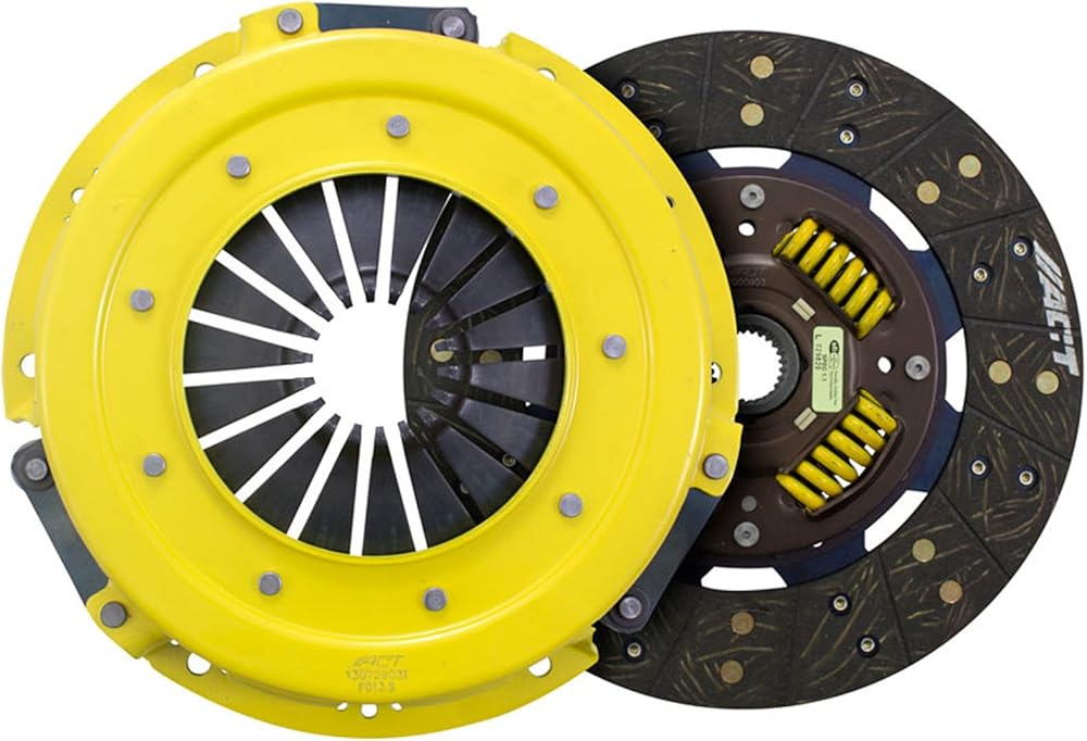 The ACT clutch kit includes a Sport pressure plate, Performance Street disc, release bearing, pilot bearing and alignment tool. The Sport pressure plate allows for a 20 to 40 percent increase in clamp load over the stock unit. ACT's Sport pressure plates have a pedal feel that is stock to moderate and are recommended for use with a street disc. ACT pressure plates use exclusive diaphragm design to increase clamp load, reduce deflection and maximize clutch life. All diaphragms endure an exclusive four-stage, heat-treating process for unparalleled performance. ACT pressure plates have precision cover stampings to provide rigidity and consistency and some are reinforced to reduce flex and improve efficiency and the feel of the pressure plate. ACT pressure plates are manufactured from new units not rebuilt from worn out parts and are 100 percent tested and computer balanced for smooth operation at high RPM. ACT's Performance Street discs are available for most popular applications. These discs are modified with reduced marcel for faster shift action to complement ACT pressure plates. Performance Street discs have higher copper content friction lining for heat tolerance and steel-backed lining for greater burst strength and durability. Also, they feature top grade rivets to securely fasten the part together. The rivet design and rivet materials are carefully selected for maximum strength. ACT spring-centered assemblies use bushings and cone springs similar to factory clutch discs. This creates frictional dampening, which improves clutch life and reduces noise. All Modified, Performance and many standard replacement discs are certified as meeting SFI Specification 1.1 and are legal in all racing organizations that require SFI certification. The kit is completed with a quality, stock replacement release bearing, pilot bearing and alignment tool.