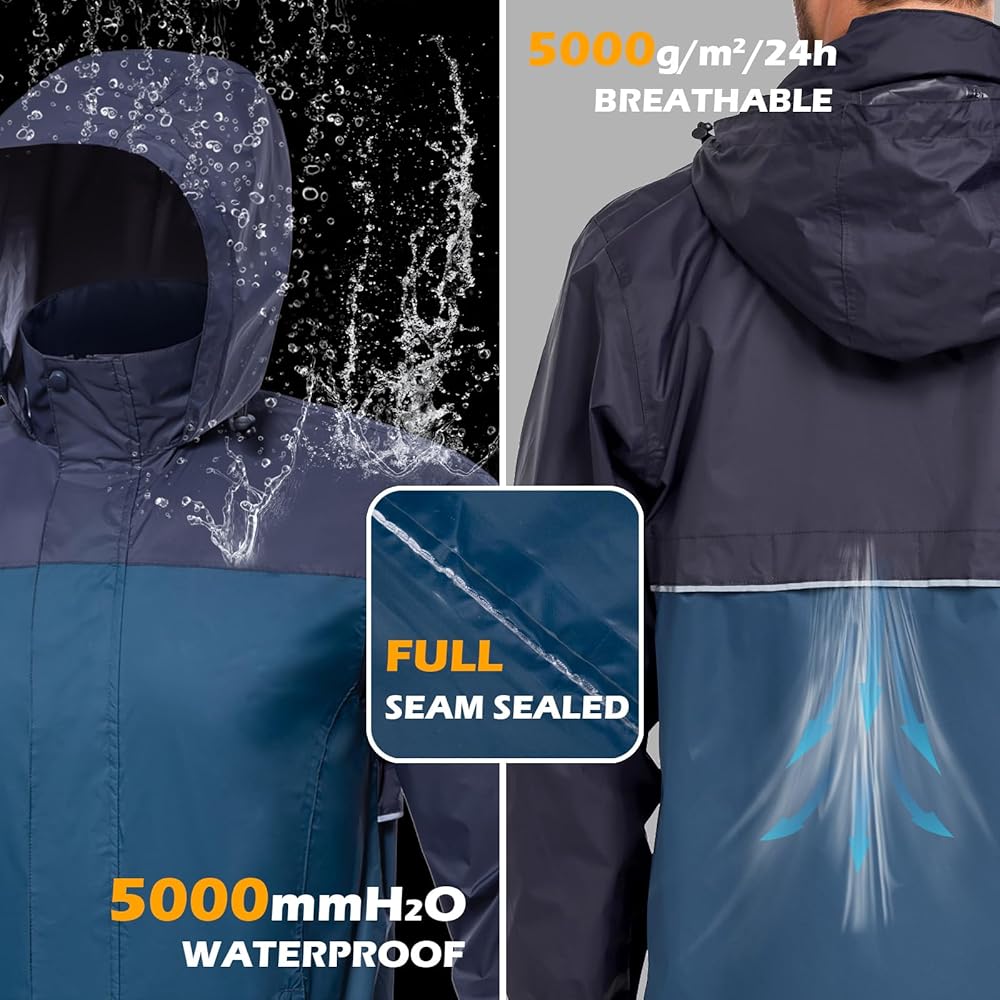 【Waterproof Rain Jacket】 MANSDOUR men's rain jackets waterproof with hood are made of 100% nylon materal, high quality waterproof fabric. Front zipper has added hook loop closure placket provide double waterproof. This lightweight rain coat for men features waterproof fabric full heat seam-sealed construction to keep you all-day dry in overcast and rainy.