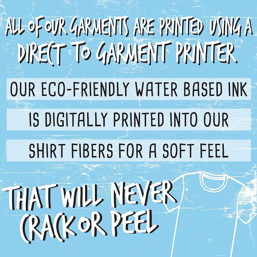 Our eco-friendly water-based ink prints directly into our shirt fibers for a smooth feel that provides a less vibrant, lived-in look. (No cracking or peeling like screen printing or iron-on transfers)