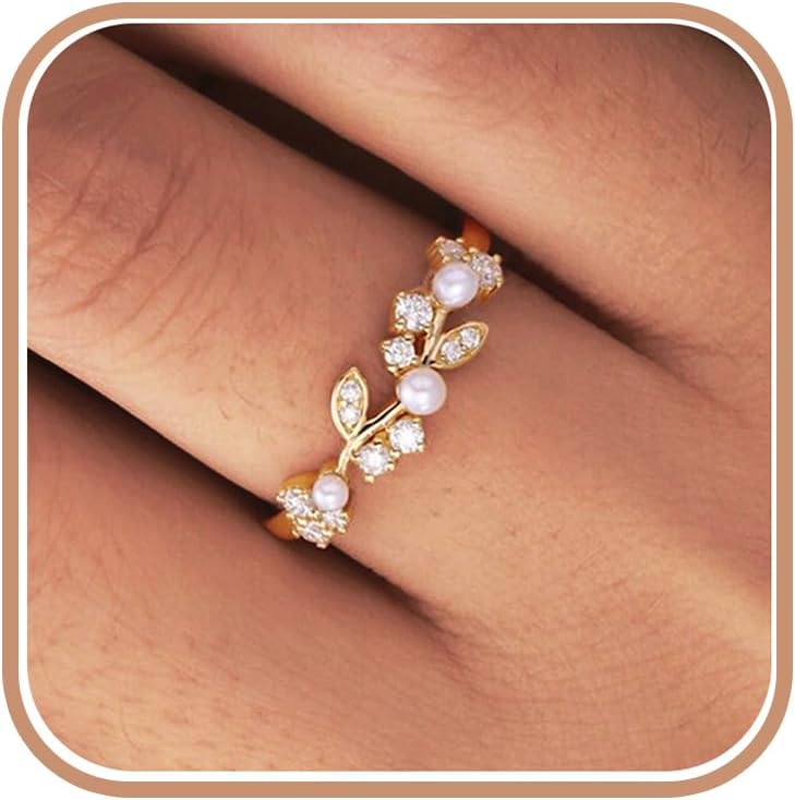 925 Sterling Silver Twig Ring for Women, 14K Gold Plated Dainty White Pearl Rings for Mother Daughter Cute Cubic Zirconia Leaf Ring Promise Statement Rings for Easter Birthday Wedding Jewelry Gift